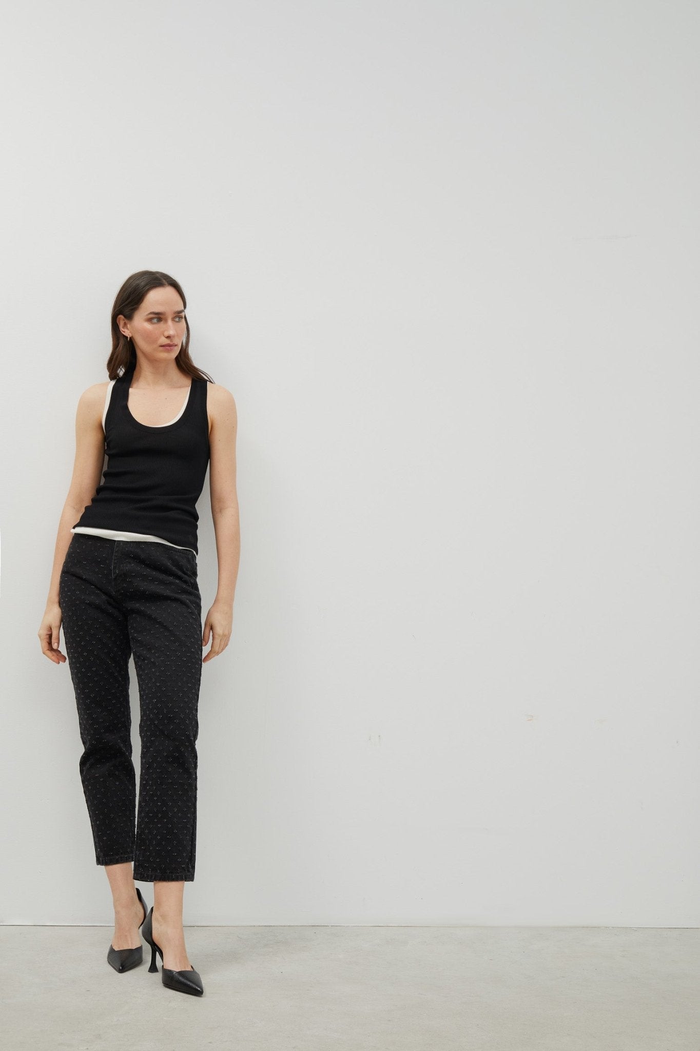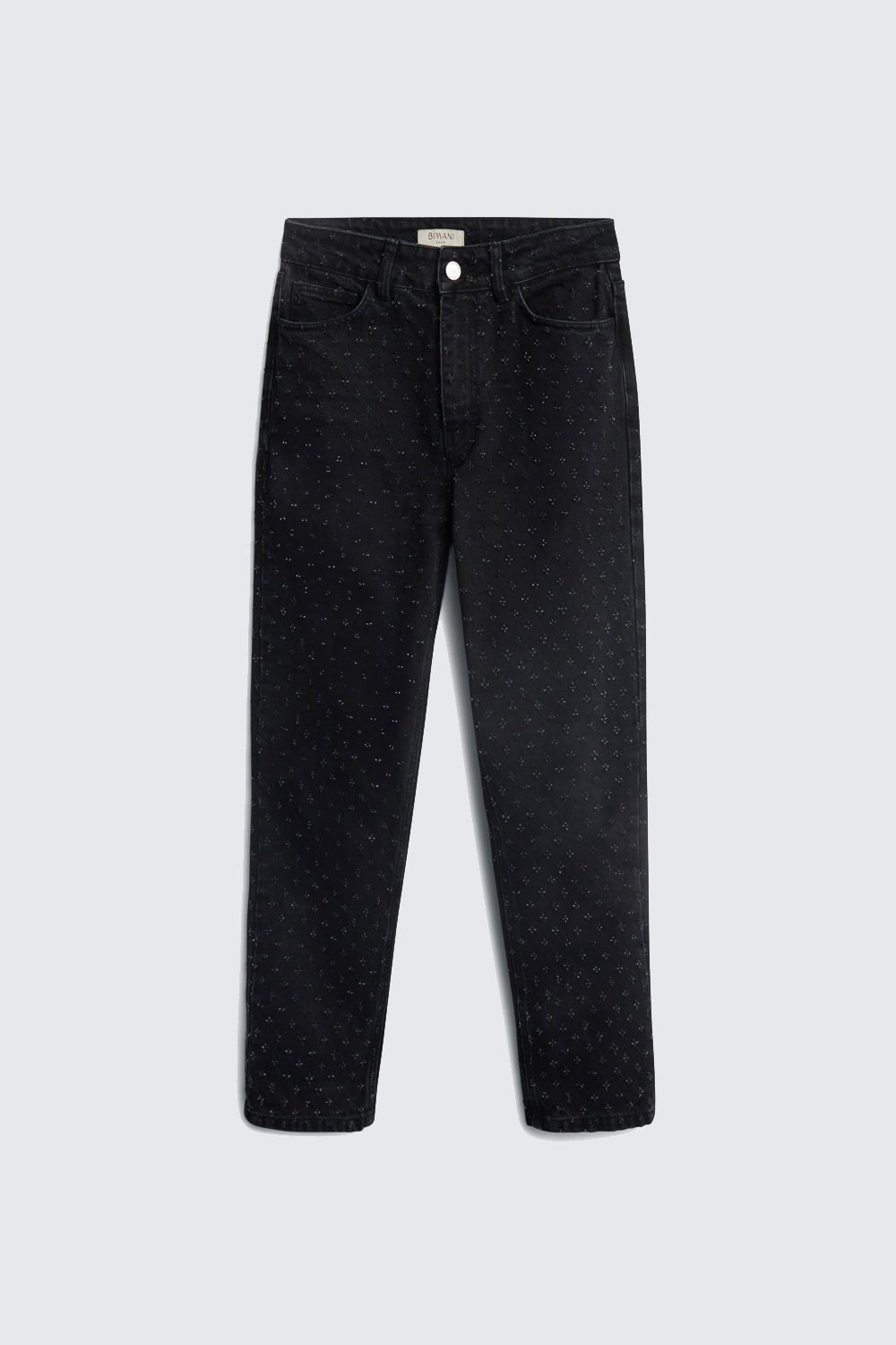 Pantalón en tejido denim. Diseño recto. Tiro alto. Cinco bolsillos.