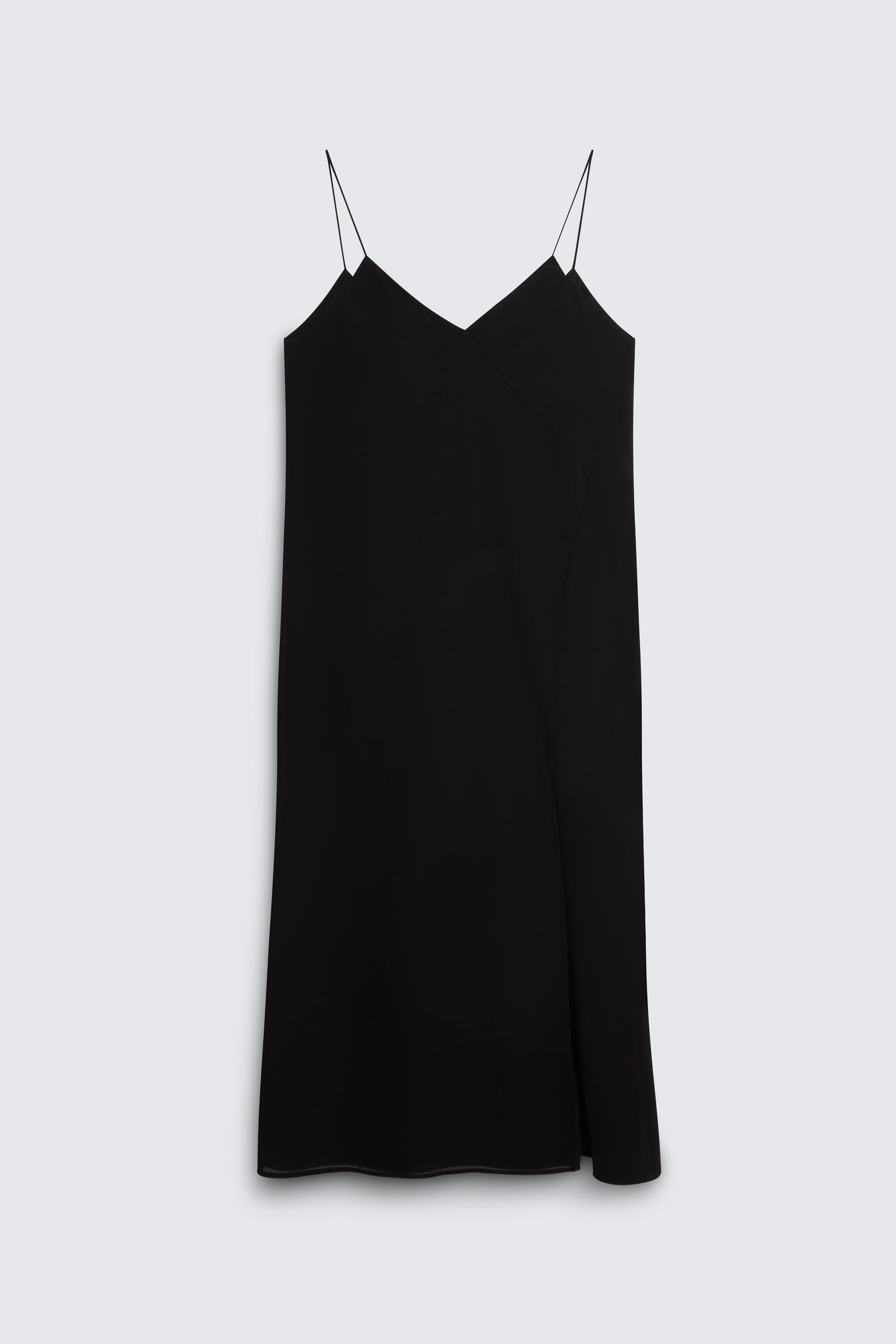 Vestido en tejido crepe georgette. Largo midi. Tirante fino. Escote pico en delantero y espalda. Detalle de costura asimétrica frontal y abertura en lateral delantero.