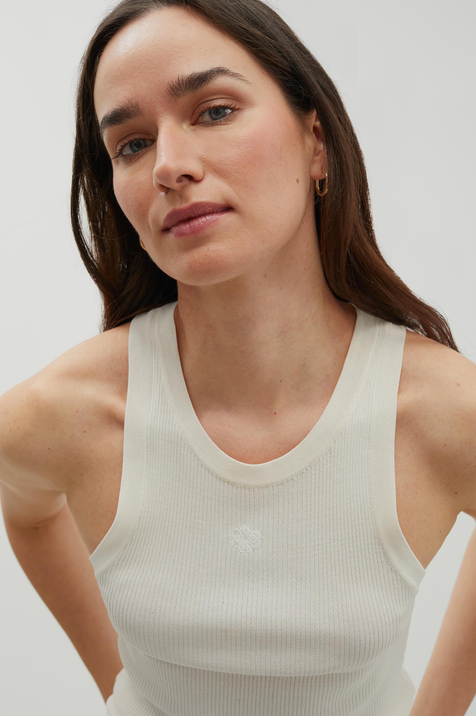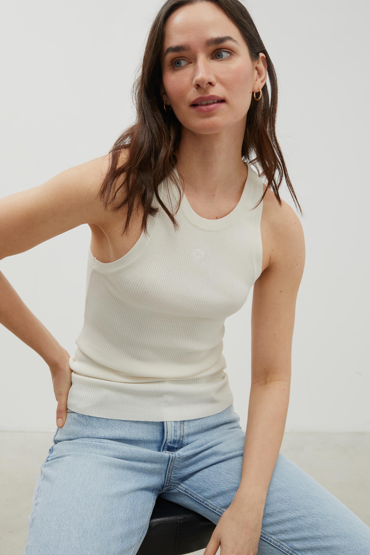 Top de canalé. Corte ajustado. Tirante ancho. Escote halter. Detalle de logo a tono bordado en delantero.