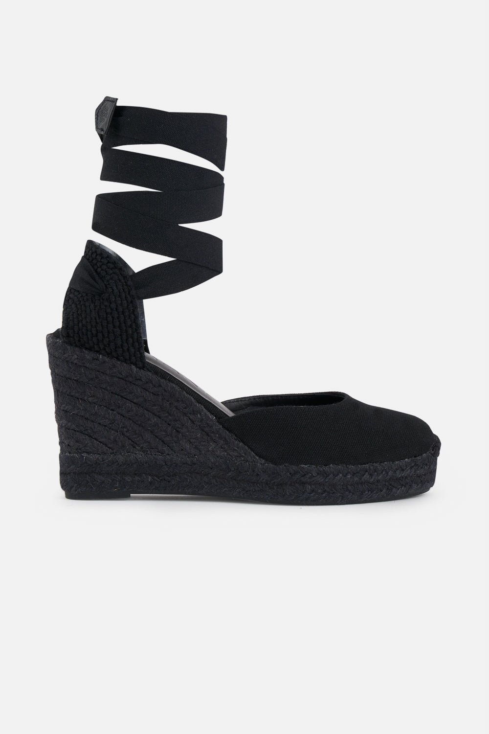 Cierre mediante lazada atada al tobillo acabada con terminaciones en efecto piel con nuestro logo grabado. Suela de yute.