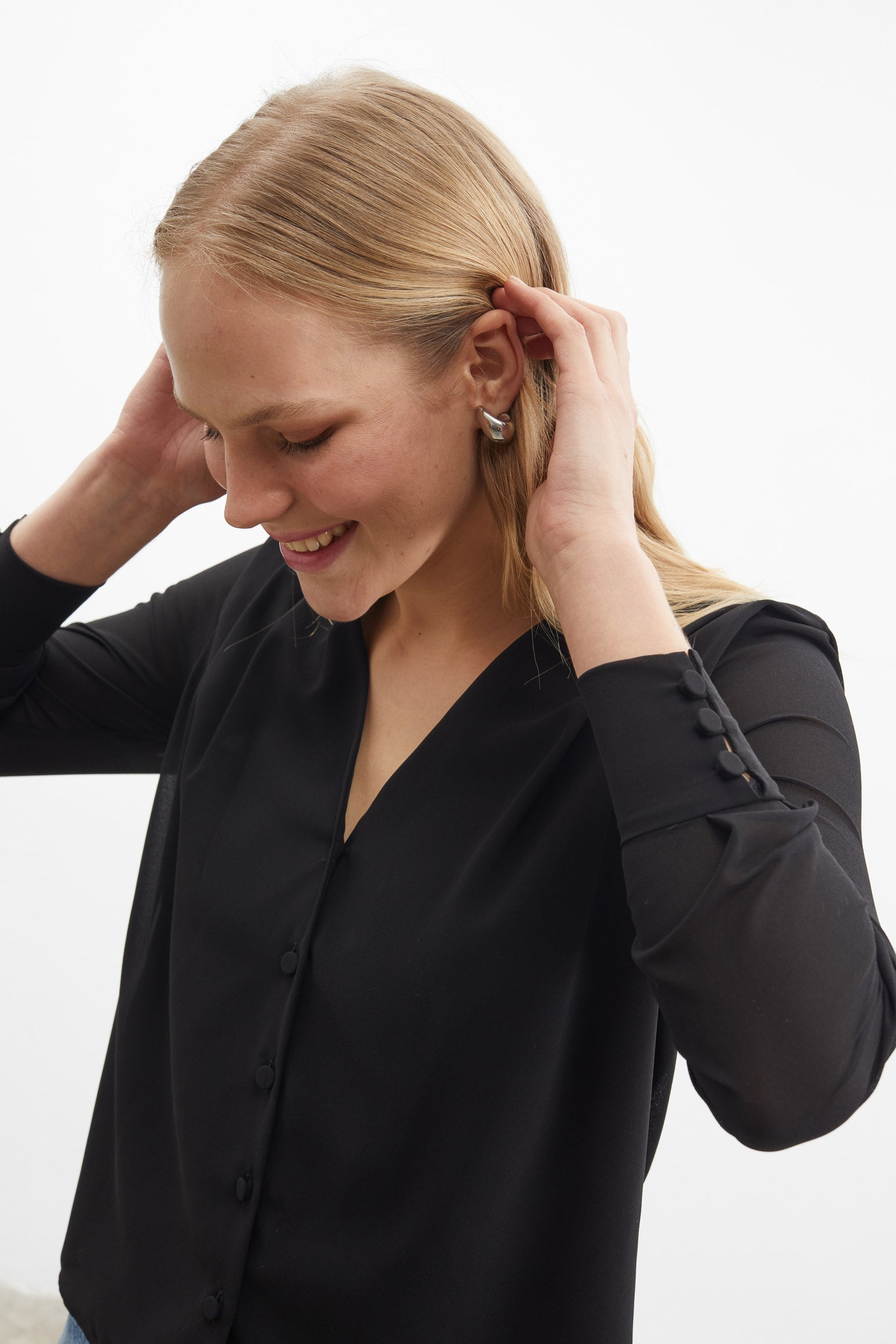 Blusa en tejido crepe georgette. Manga larga. Abullonada en puño. Escote de pico. Detalle de tablas en hombros. Cierre de botón forrado en delantero y puños. Diseño Twist que permite llevar el escote de pico en el delantero o en la espalda.