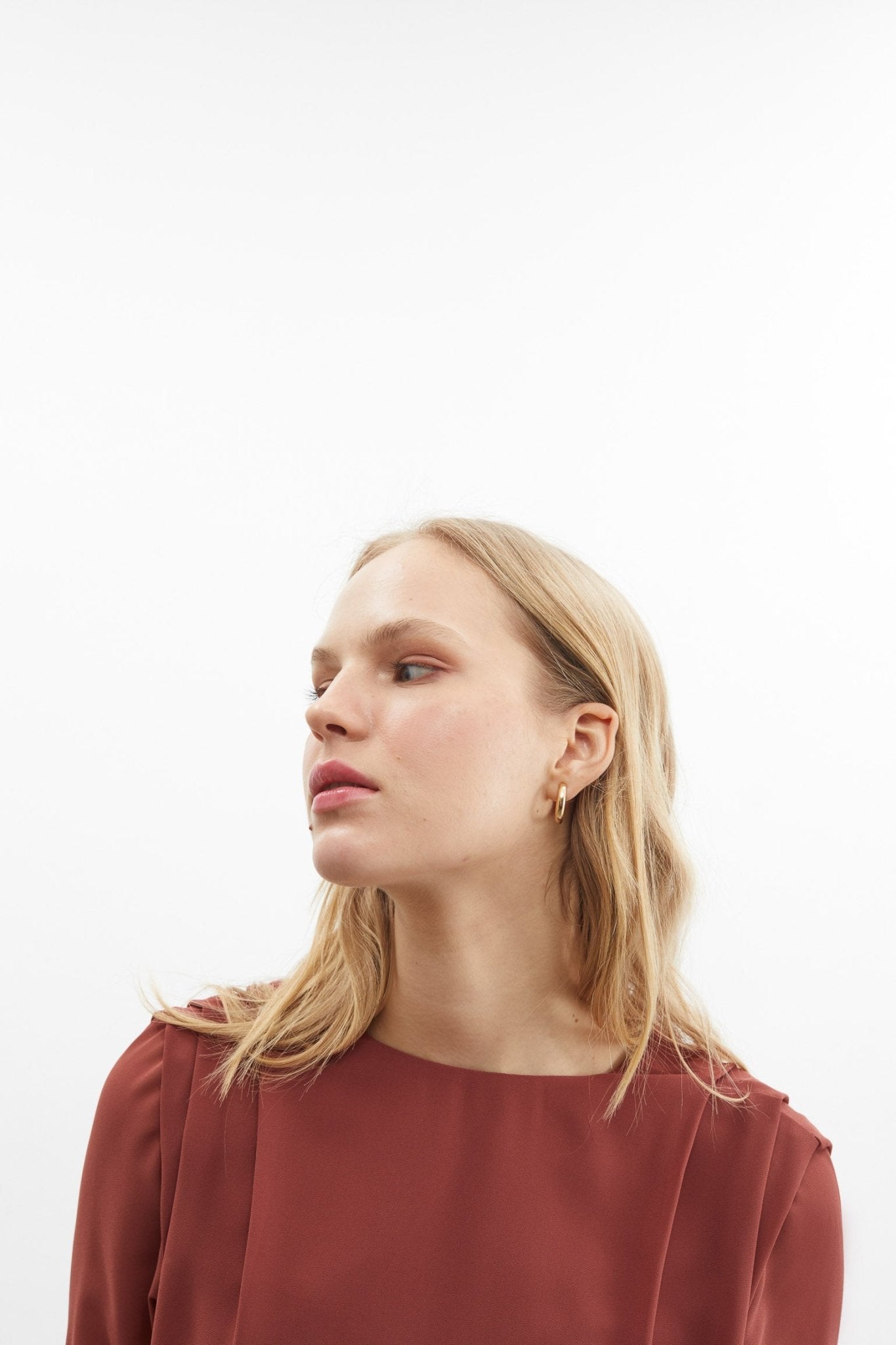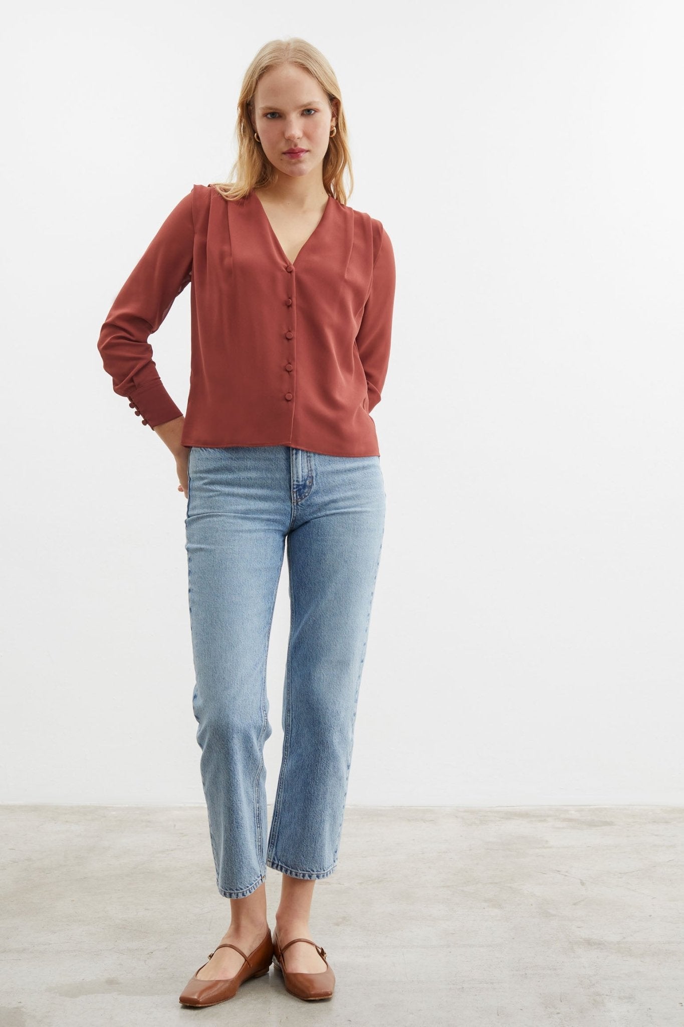 Blusa en tejido crepe georgette. Manga larga. Abullonada en puño. Escote de pico. Detalle de tablas en hombros. Cierre de botón forrado en delantero y puños. Diseño Twist que permite llevar el escote de pico en el delantero o en la espalda.