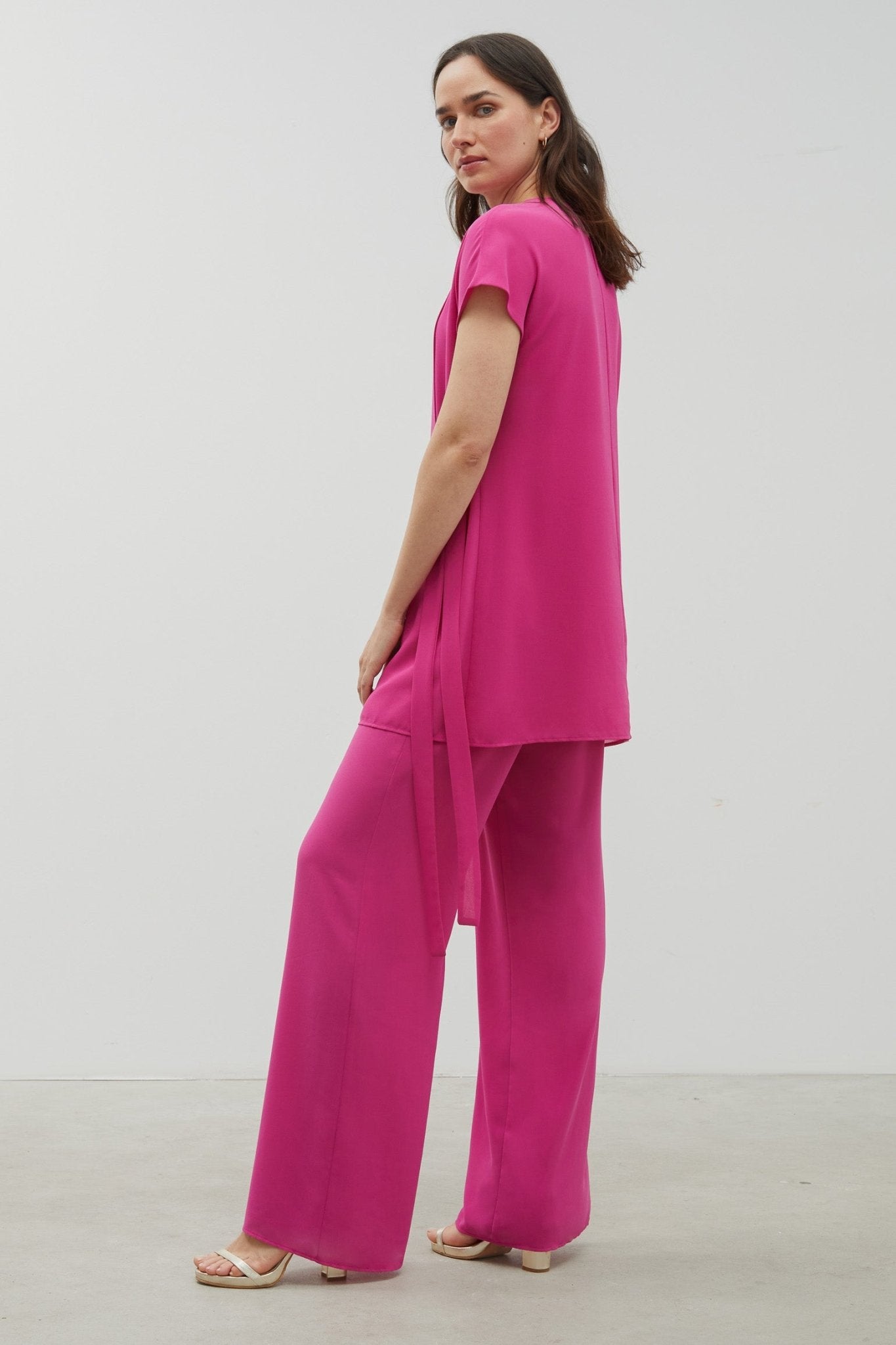 Blusa en tejido crepe georgette. Manga corta. Escote caja. Corte amplio. Detalle de lazada en delantero para ajustar al cuerpo. Cierre mediante lágrima y botón forrado en espalda.
