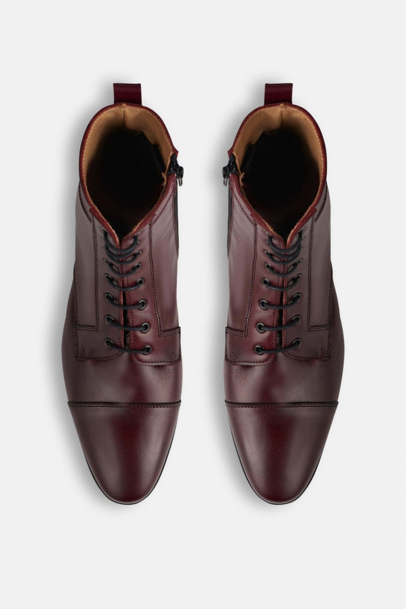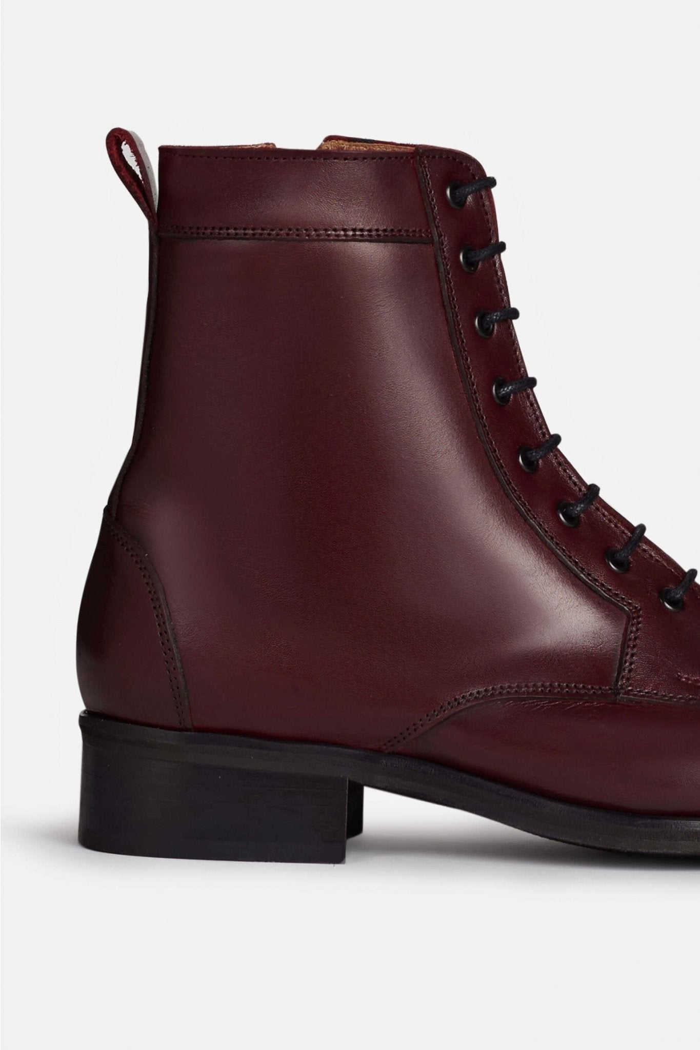 Botín de piel. Cordones en el delantero. Tirador en la parte trasera. Cierre mediante cremallera en la parte interior.