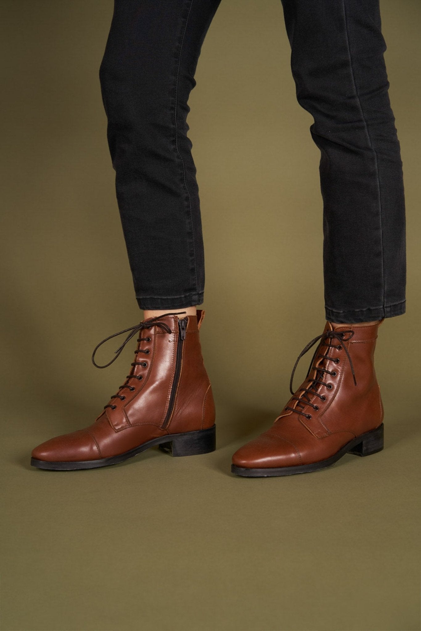 Botín de piel. Cordones en el delantero. Tirador en la parte trasera. Cierre mediante cremallera en la parte interior.