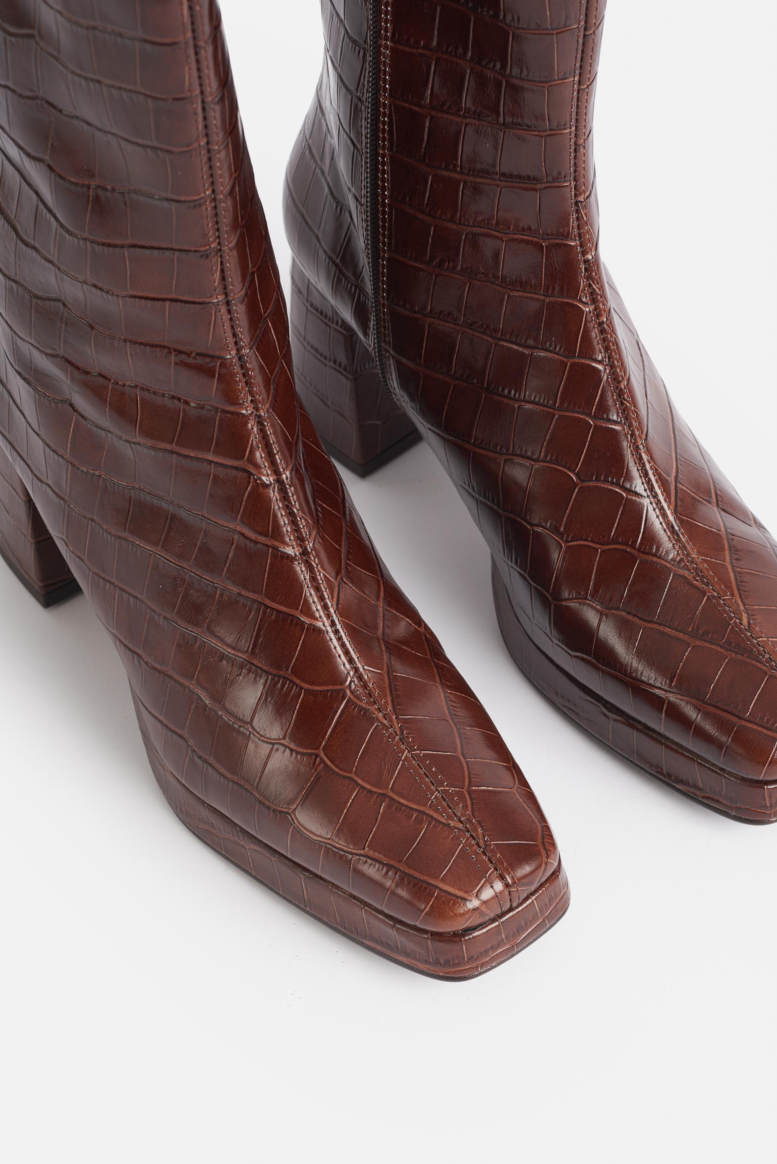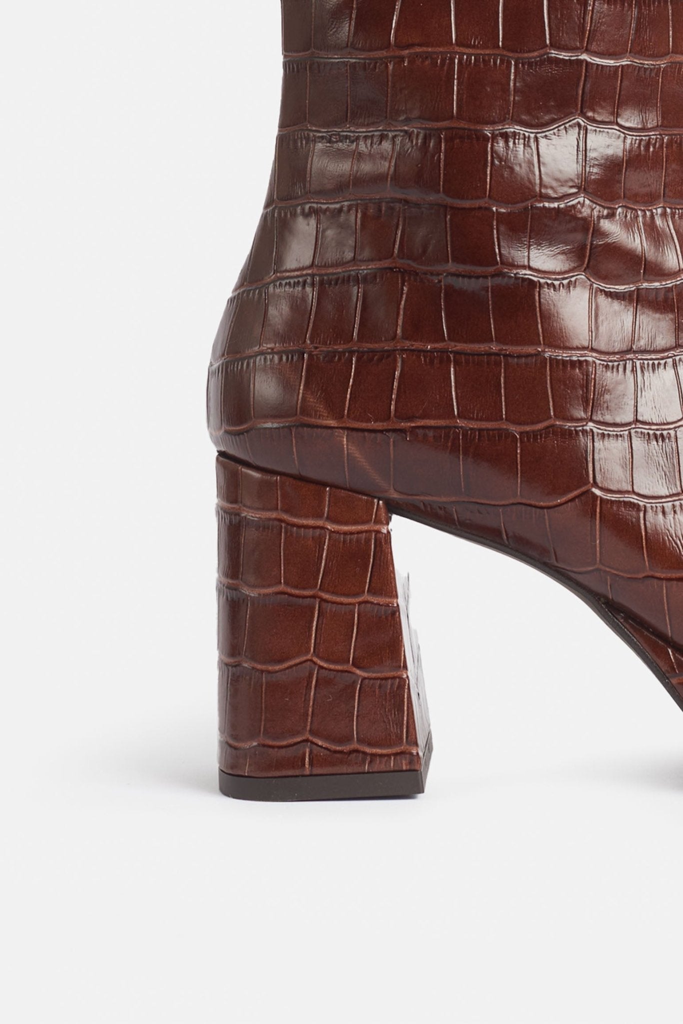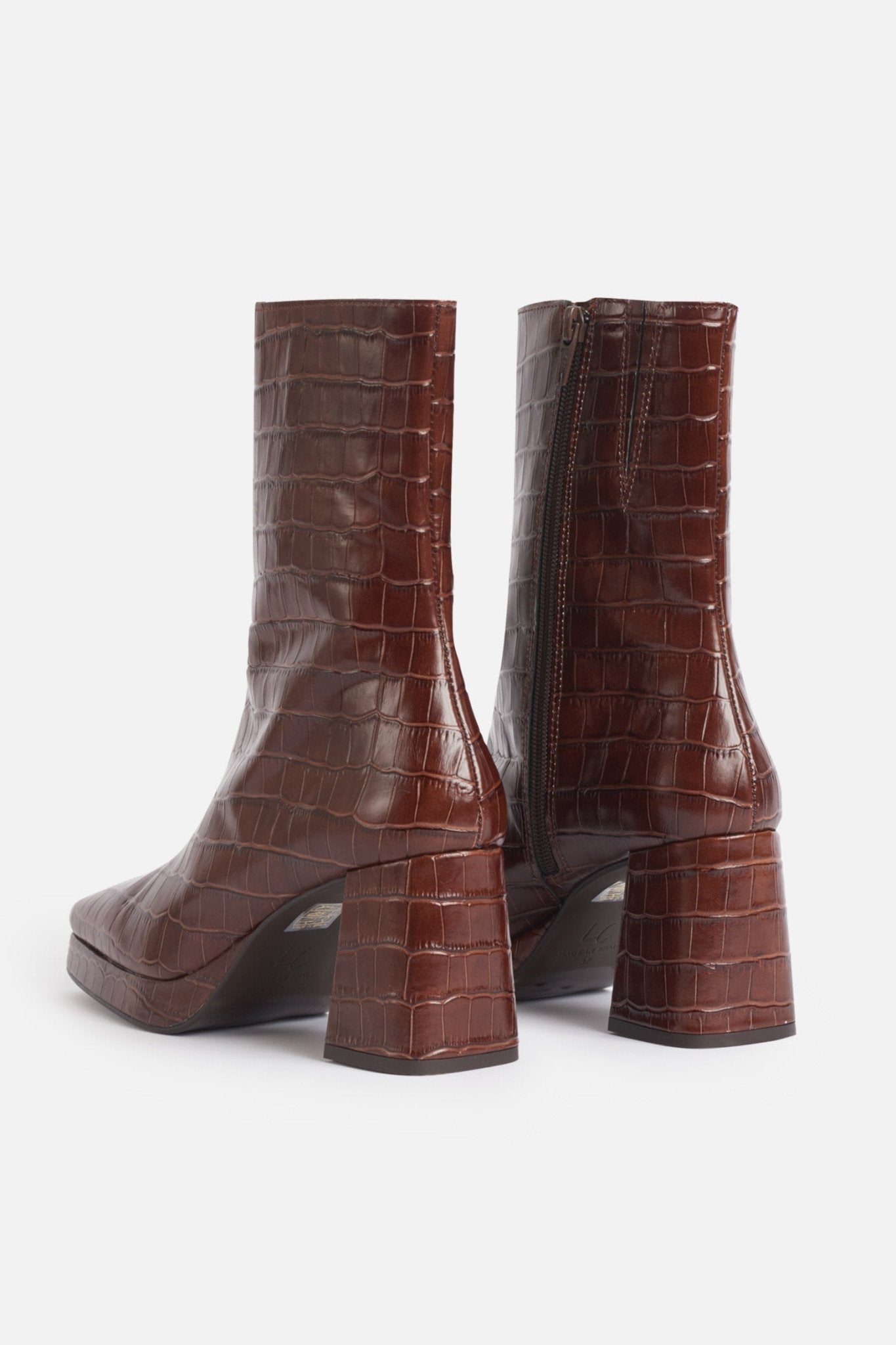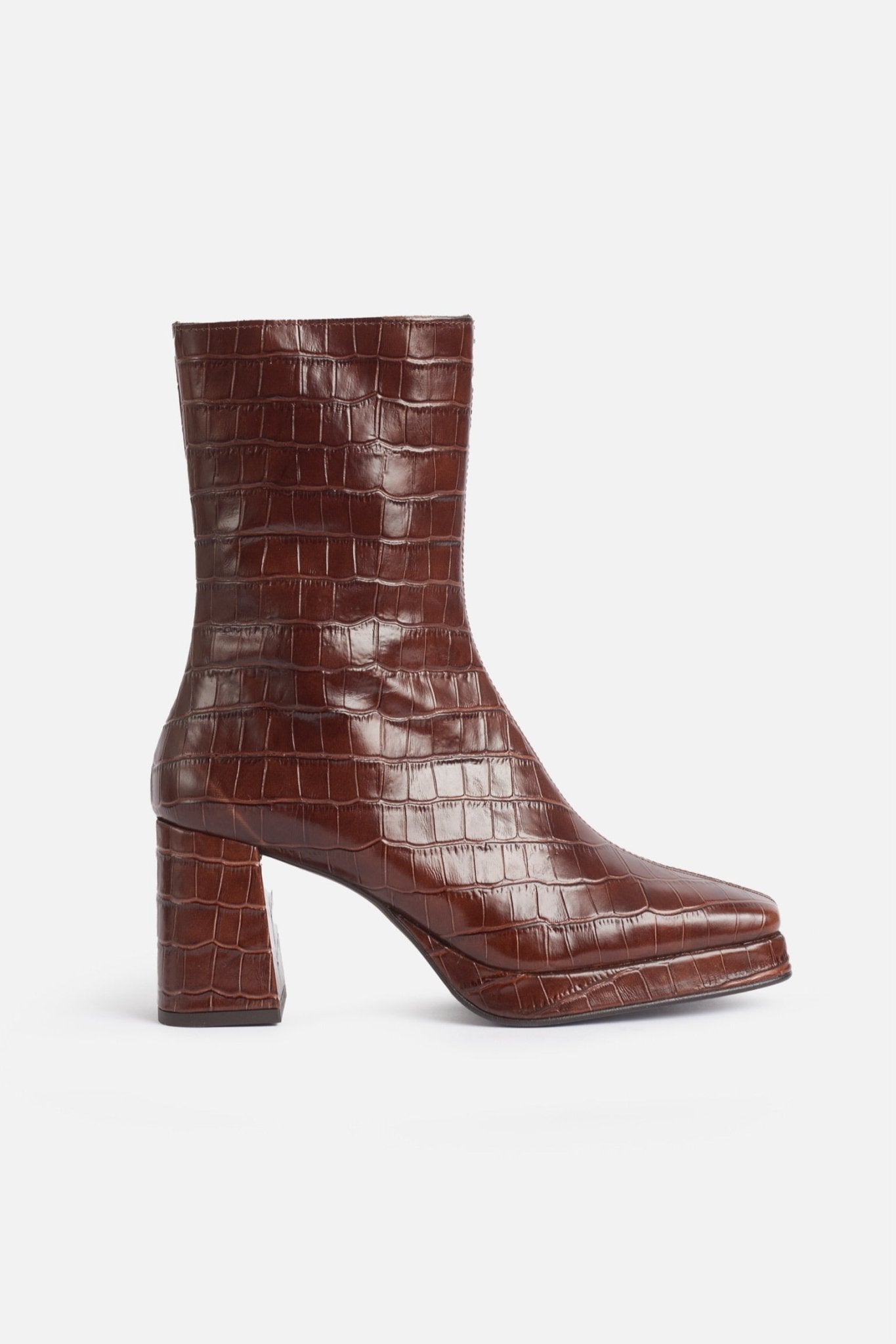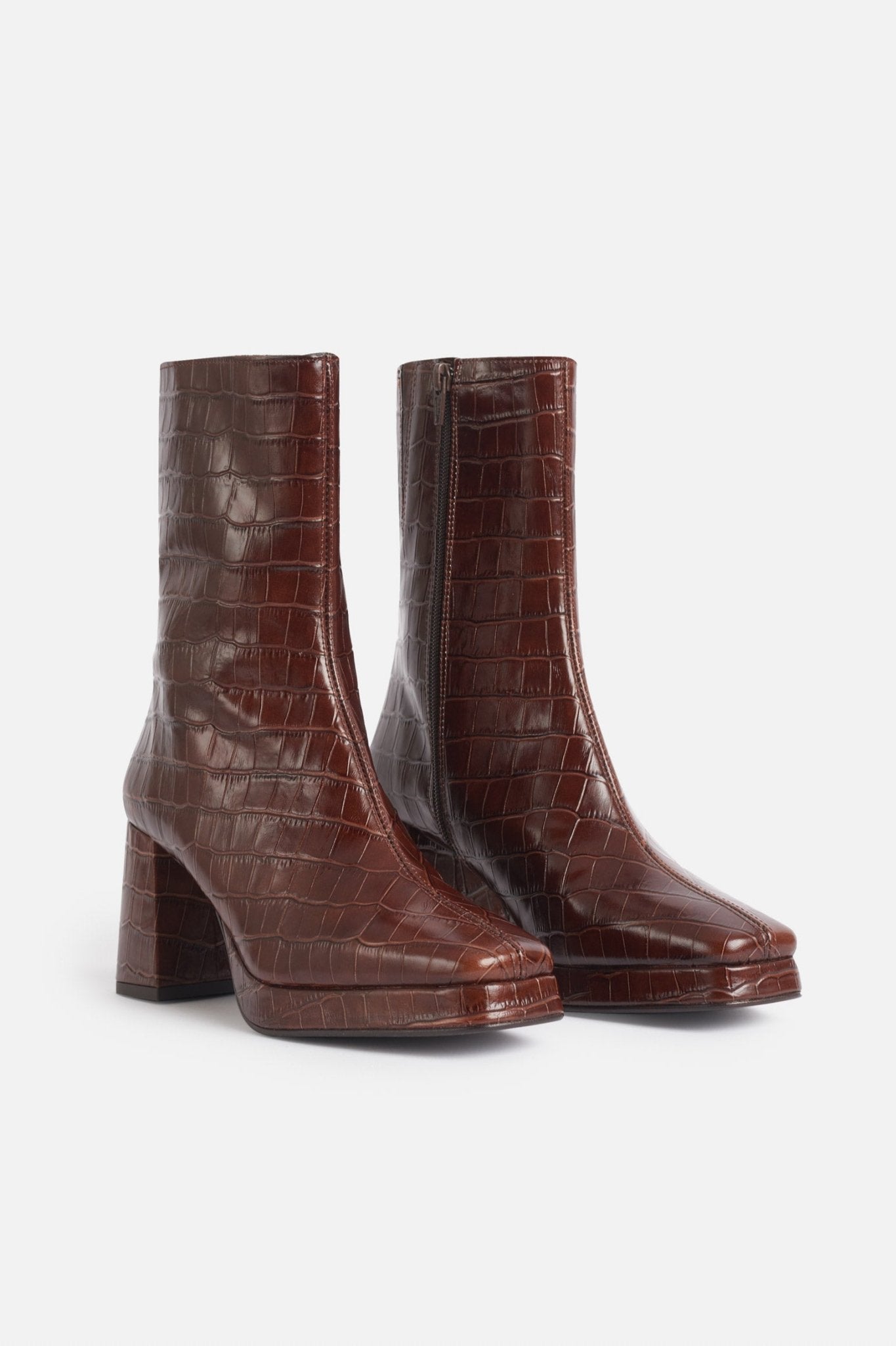 Botín de piel. Cremallera lateral. Caña media. Tacón de 7cm. Plataforma de 2cm. Altura caña de 19,5cm.