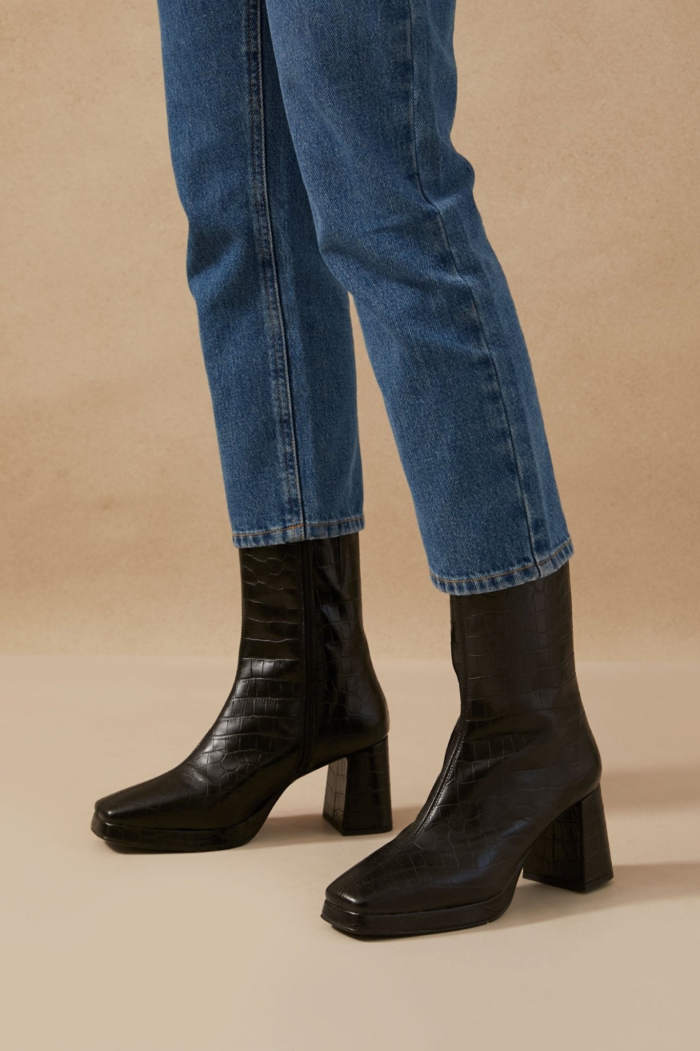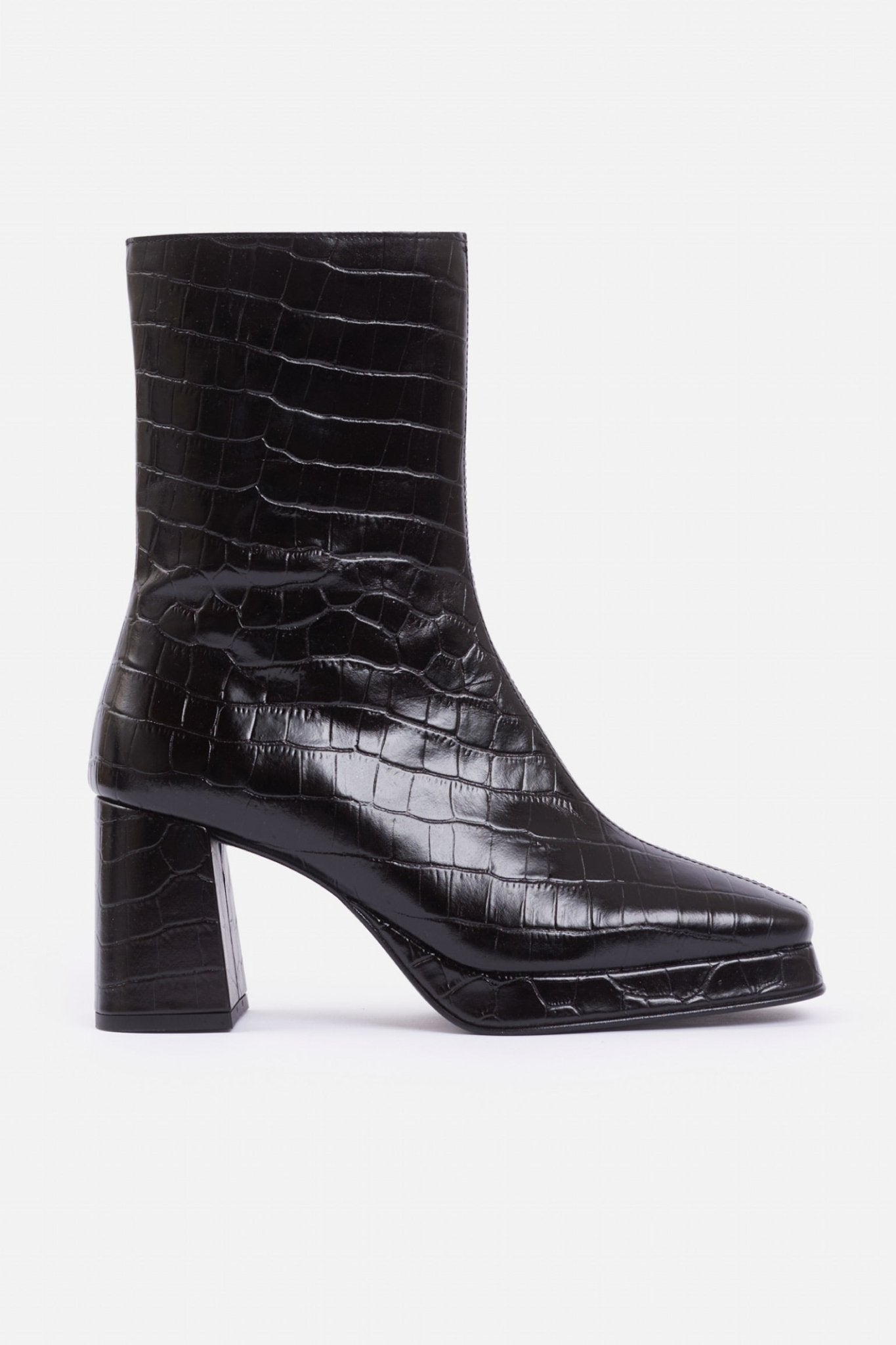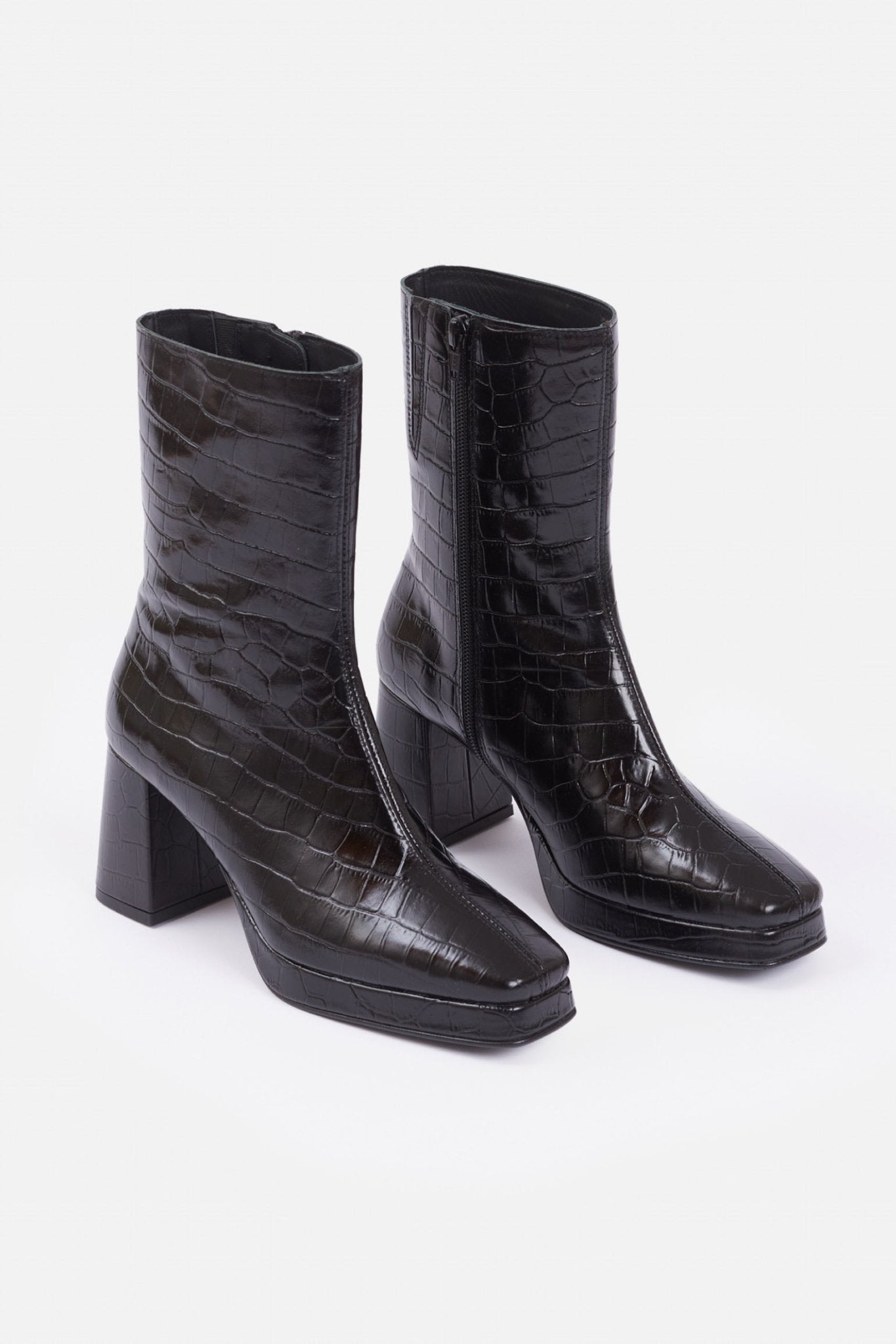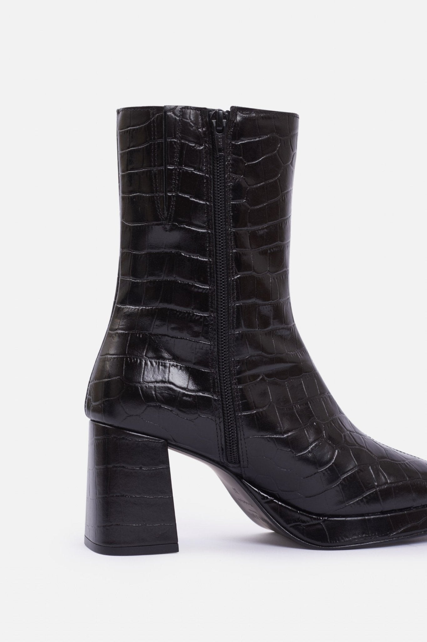 Botín de piel. Cremallera lateral. Caña media. Tacón de 7cm. Plataforma de 2cm. Altura caña de 19,5cm.