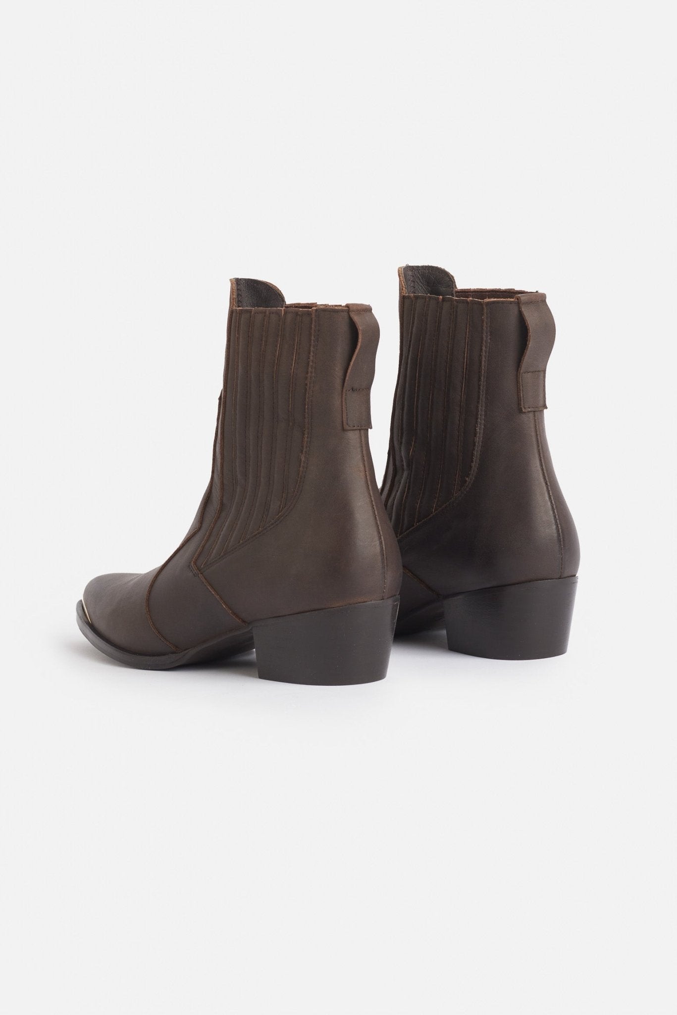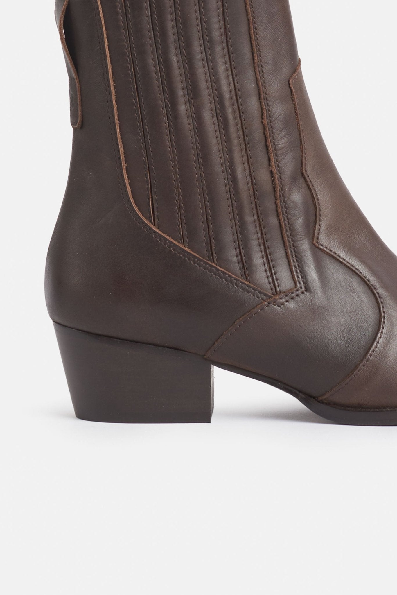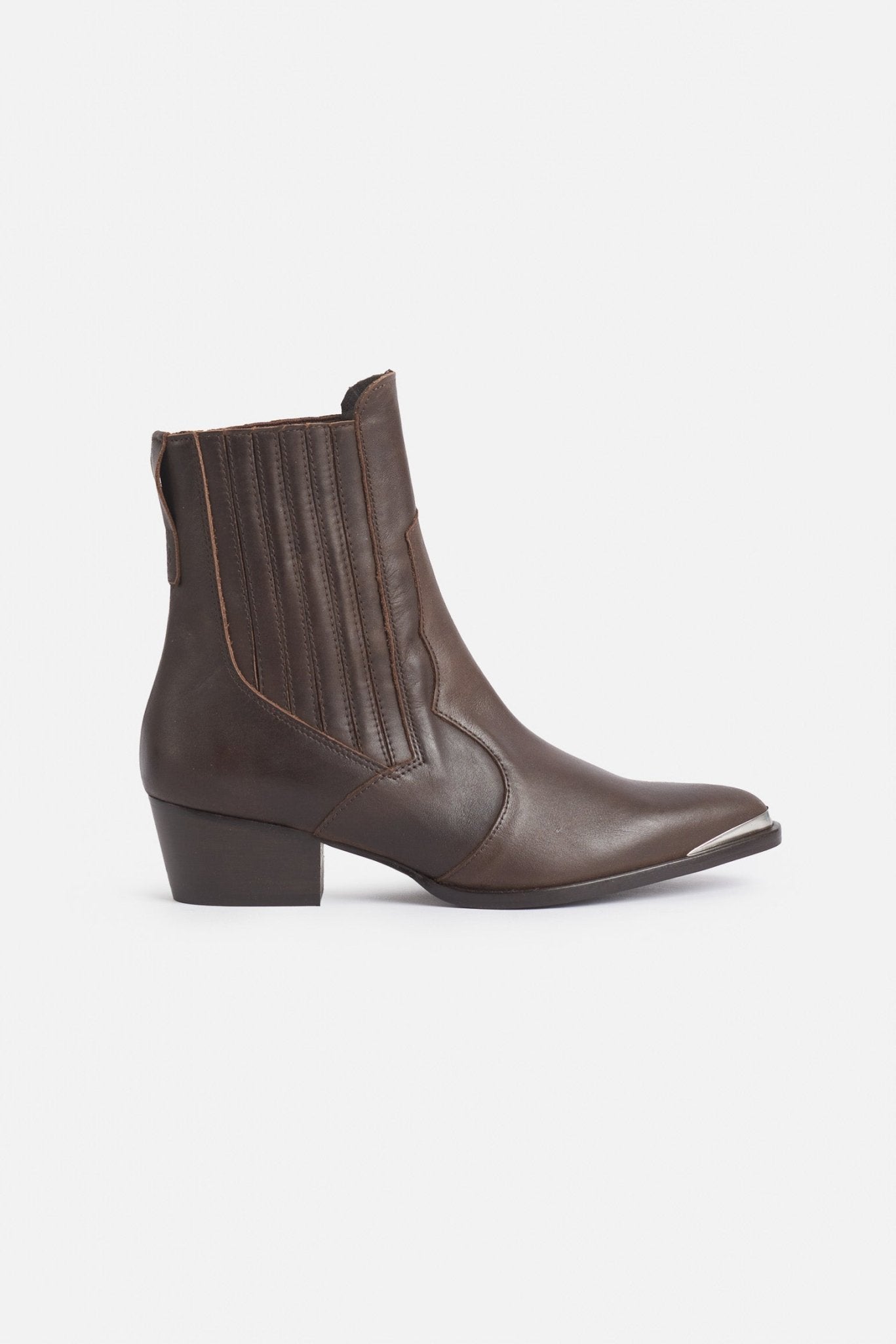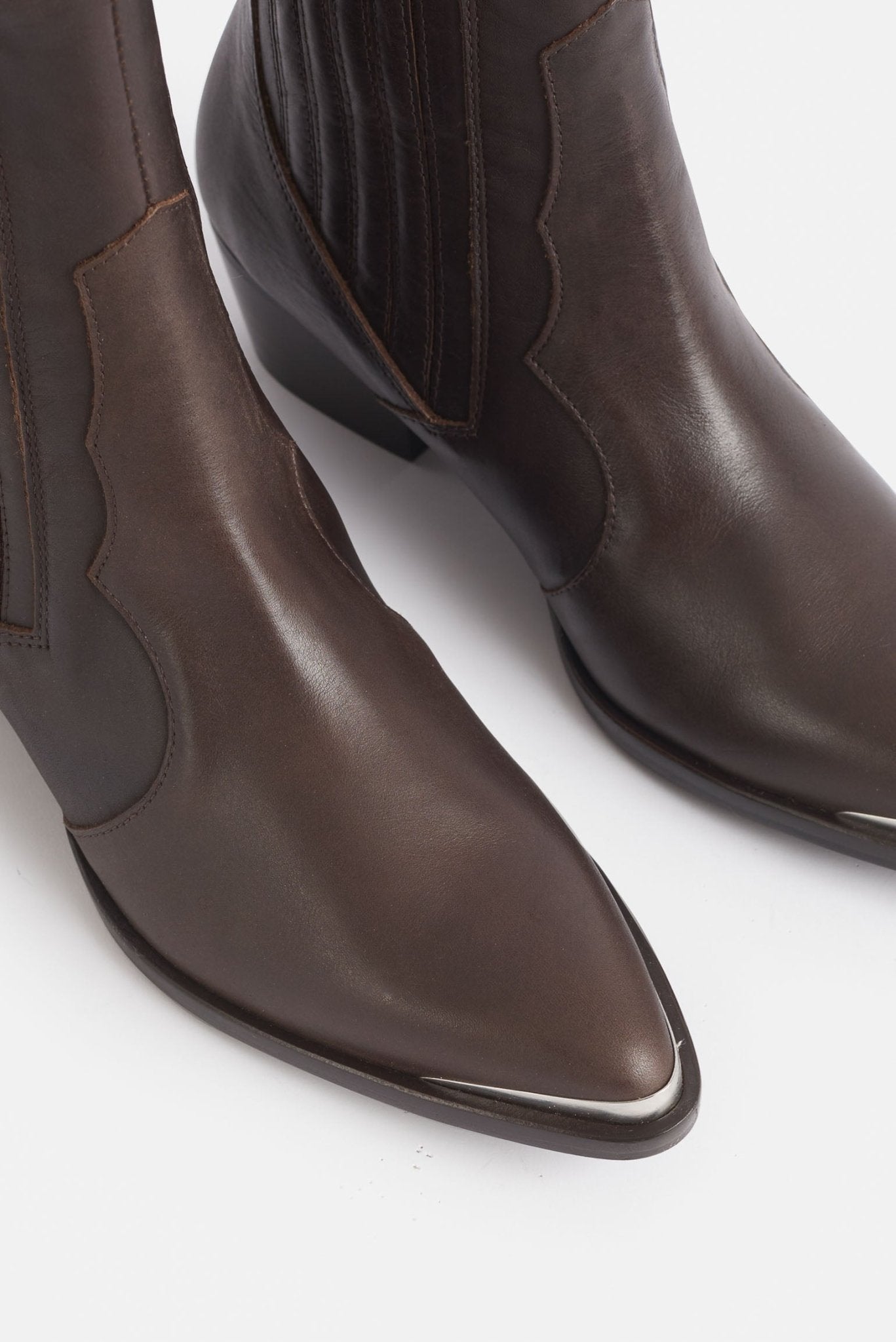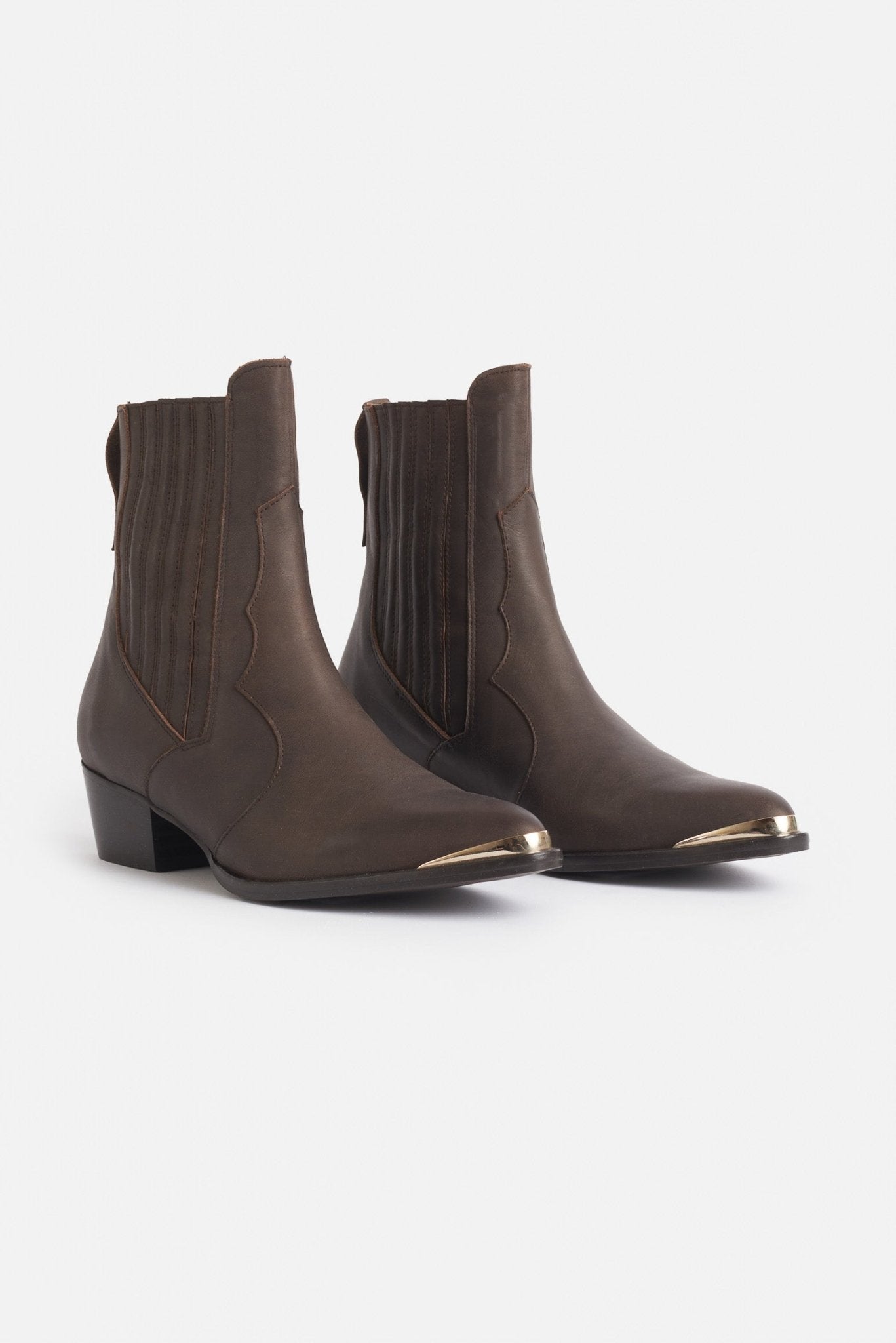 Botín de piel. Puntera metalizada. Detalle de tirador trasero. Elásticos vistos forrados en piel en los laterales. Alto del tacón de 4cm. Altura caña de 16cm.