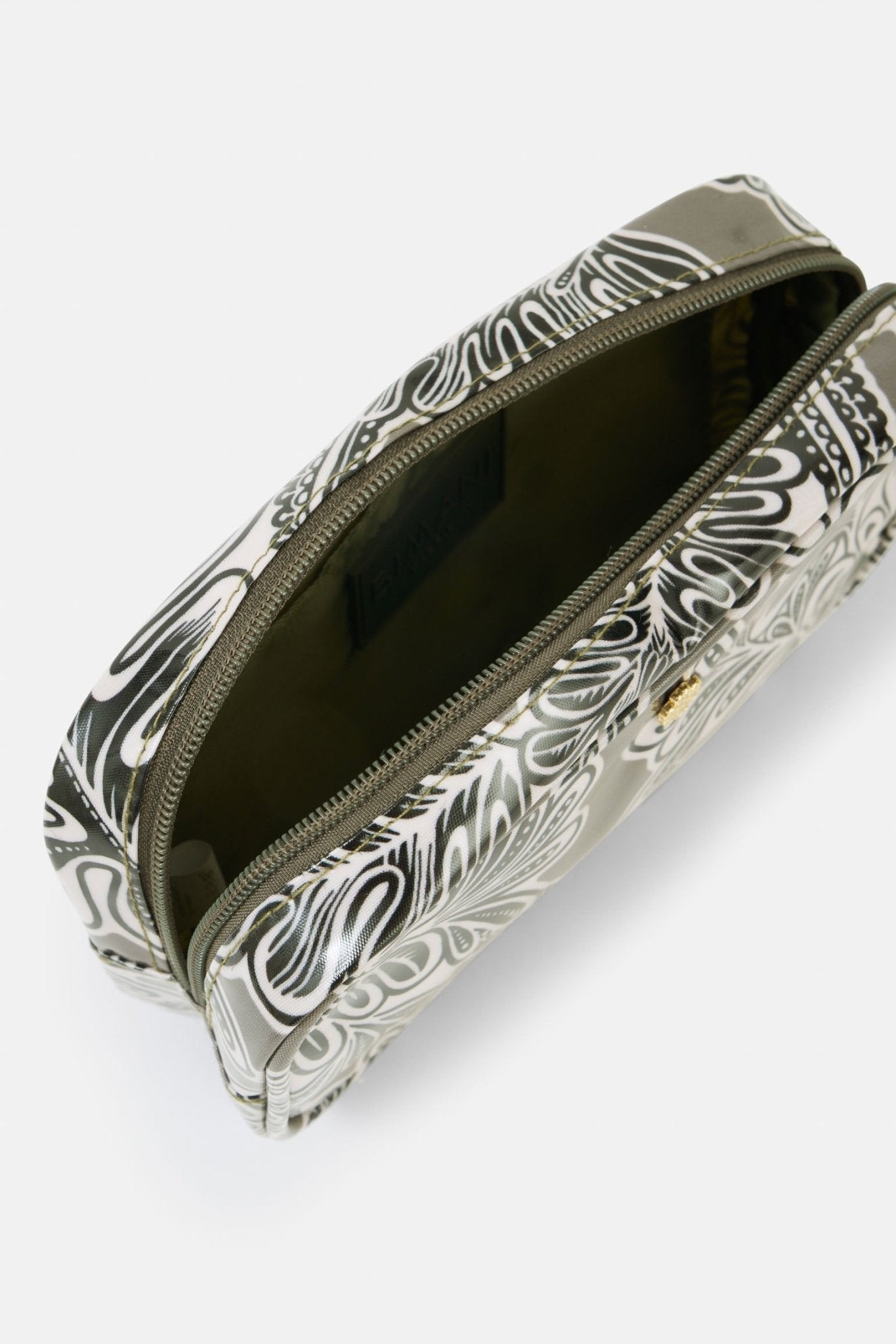 Neceser alargado con estampado plastificado. Cierre de cremallera y bolsillo interior.