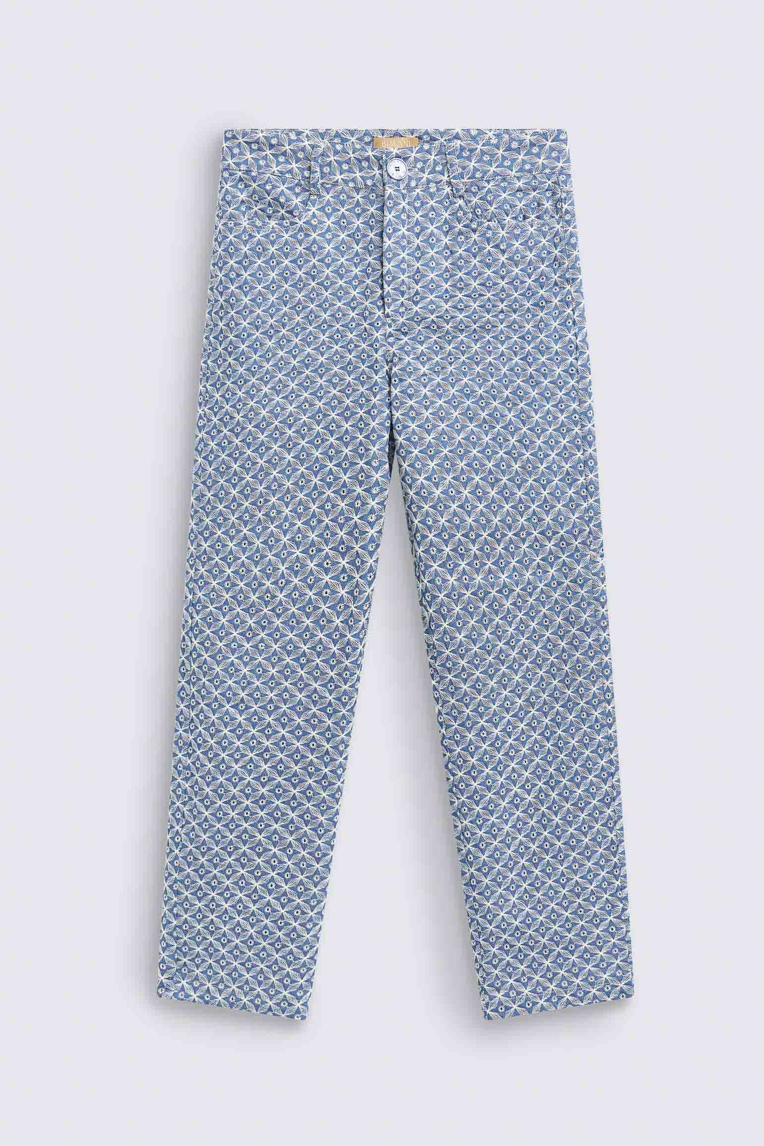 Pantalón en tejido denim calado. Corte recto. Tiro alto. Cinco bolsillos.