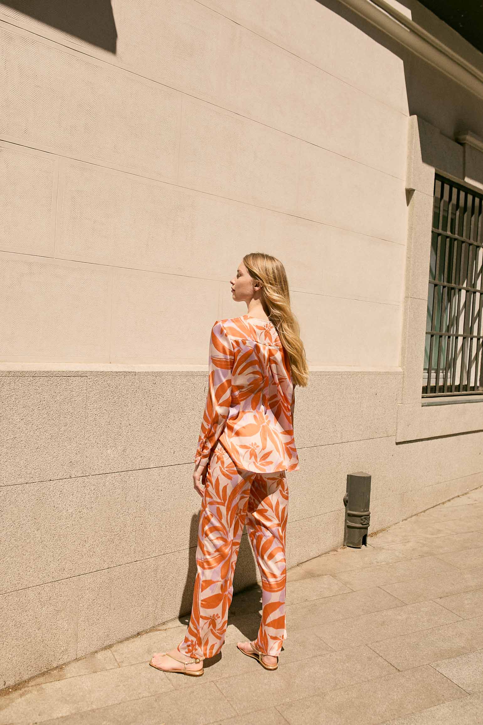 Pantalón en tejido satinado estampado. Corte recto y ancho. Tiro alto y cinturilla con detalle de goma en la espalda. Bolsillos laterales. Cierre mediante cremallera invisible lateral.