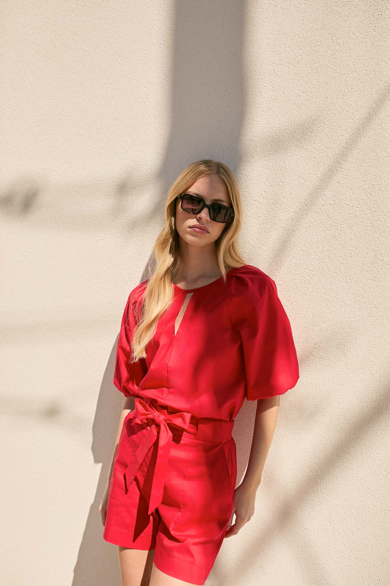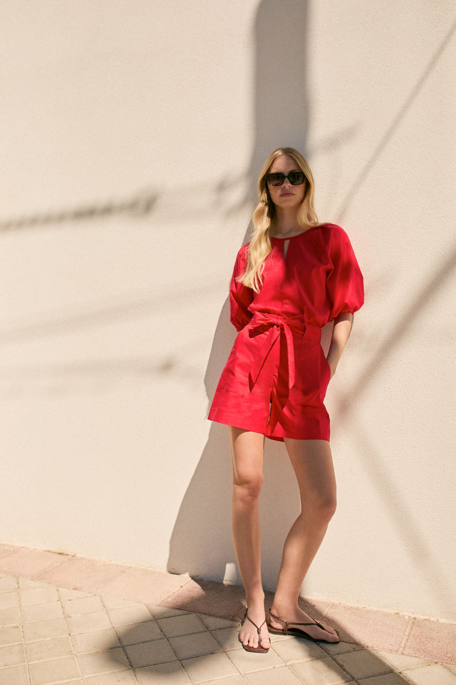 Pantalón en tejido de popelín. Largo corto. Tiro alto. Bolsillos en delantero. Detalle de lazada que permite que se ajuste a la cintura. Goma elástica en espalda. Cierre mediante cremallera oculta por tapeta y enganches metálicos.