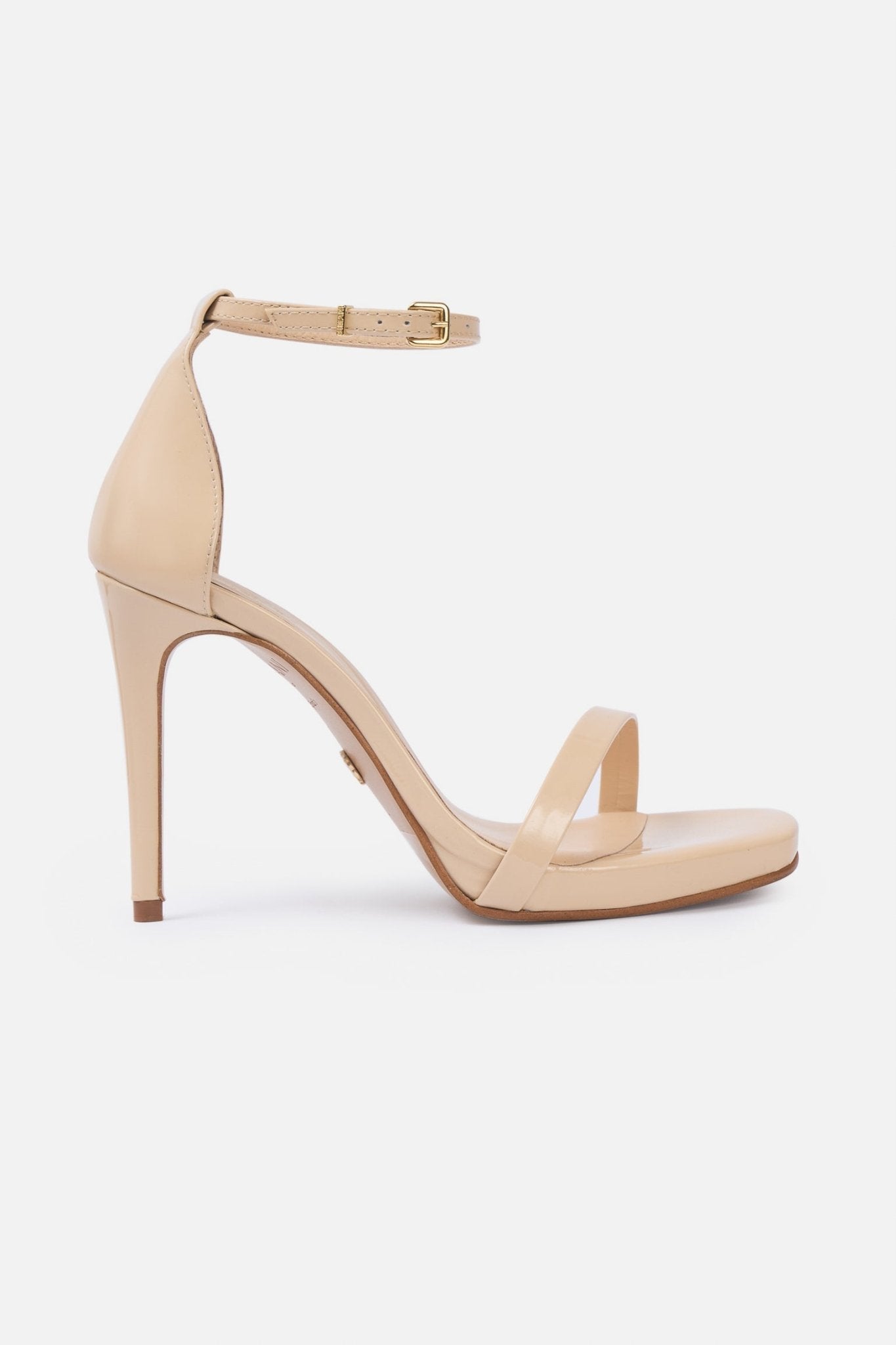 Sandalia de piel. Puntera cuadrada descubierta. Tira fina en el delantero. Talón cubierto. Fina tira abrochada al tobillo. Alto del tacón de 10,5cm. Plataforma de 1,5cm.