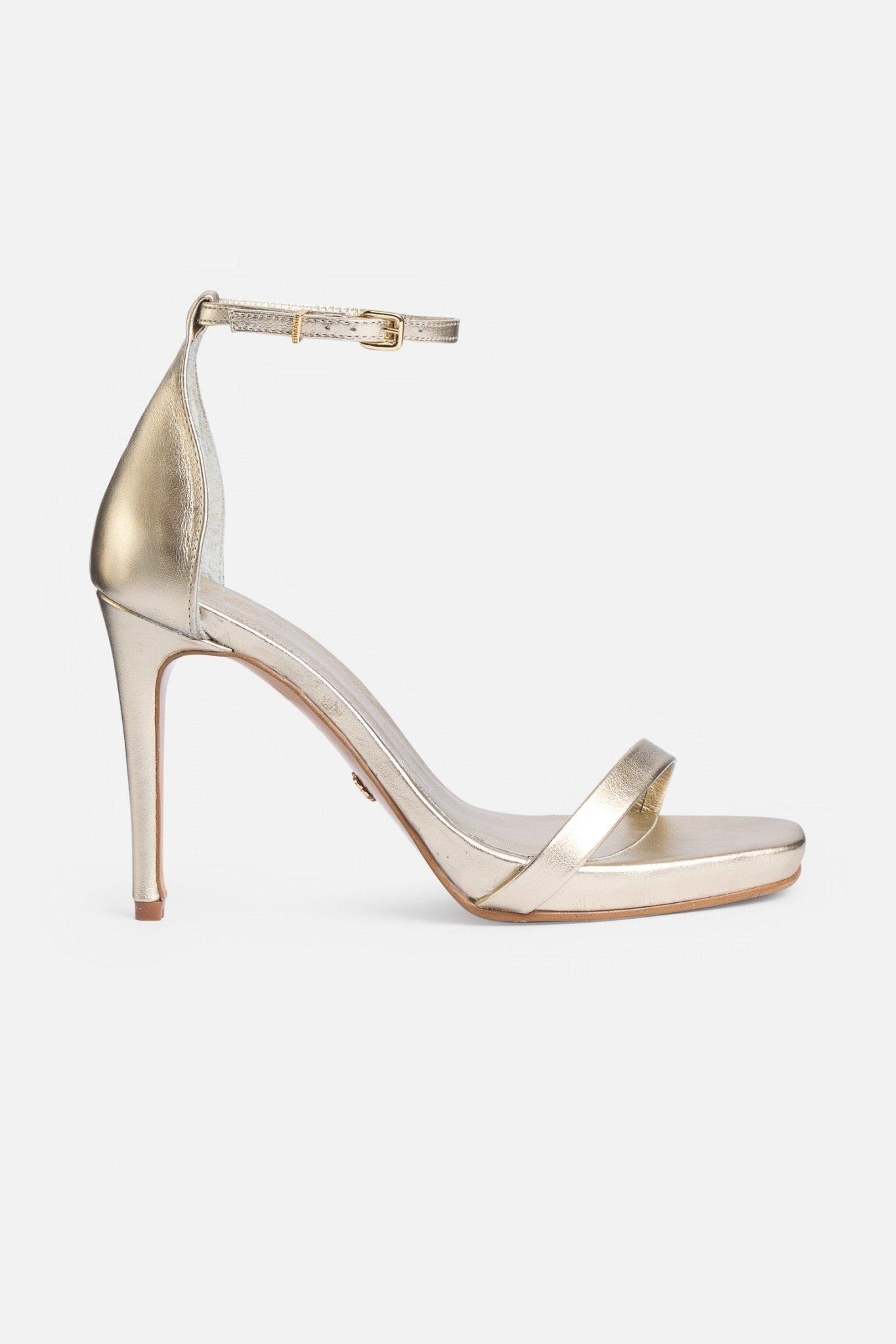 Sandalia de piel. Puntera cuadrada descubierta. Tira fina en el delantero. Talón cubierto. Fina tira abrochada al tobillo. Alto del tacón de 10,5cm. Plataforma de 1,5cm.