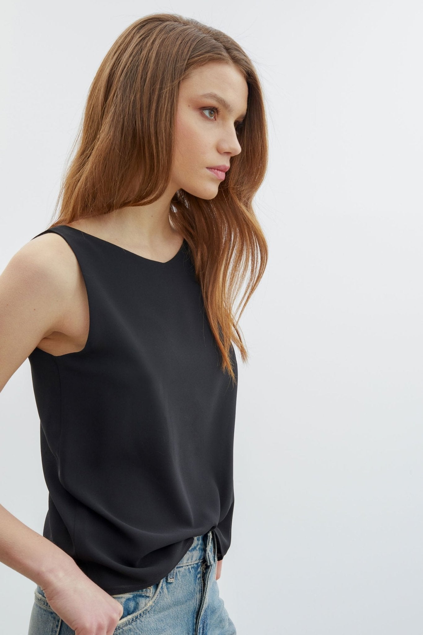 Top en nuestro tejido crepe georgette. Tirante ancho. Escote de pico por un lado y cerrado por otro. Diseño Twist que permite llevar el escote en pico en el delantero o en la espalda.