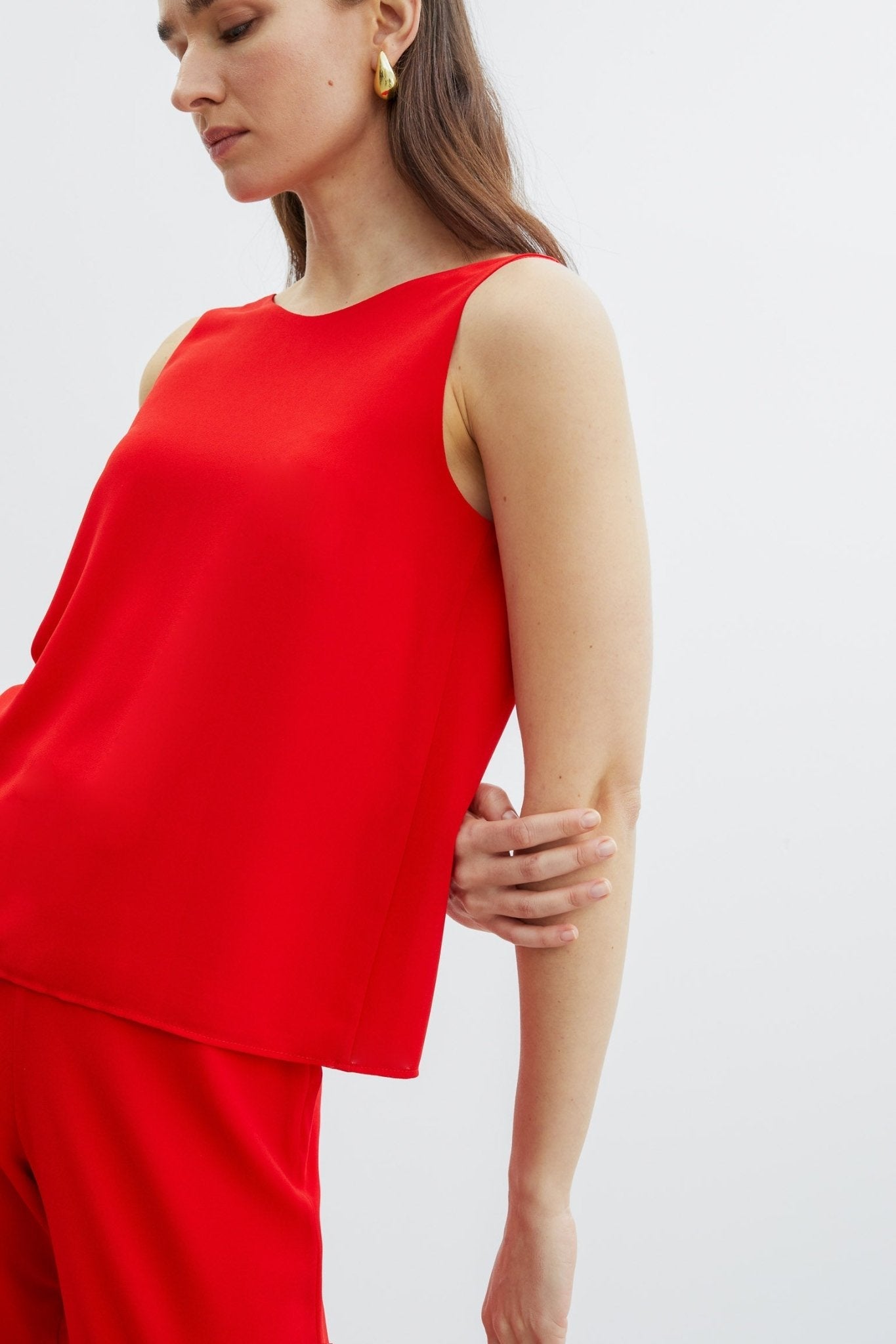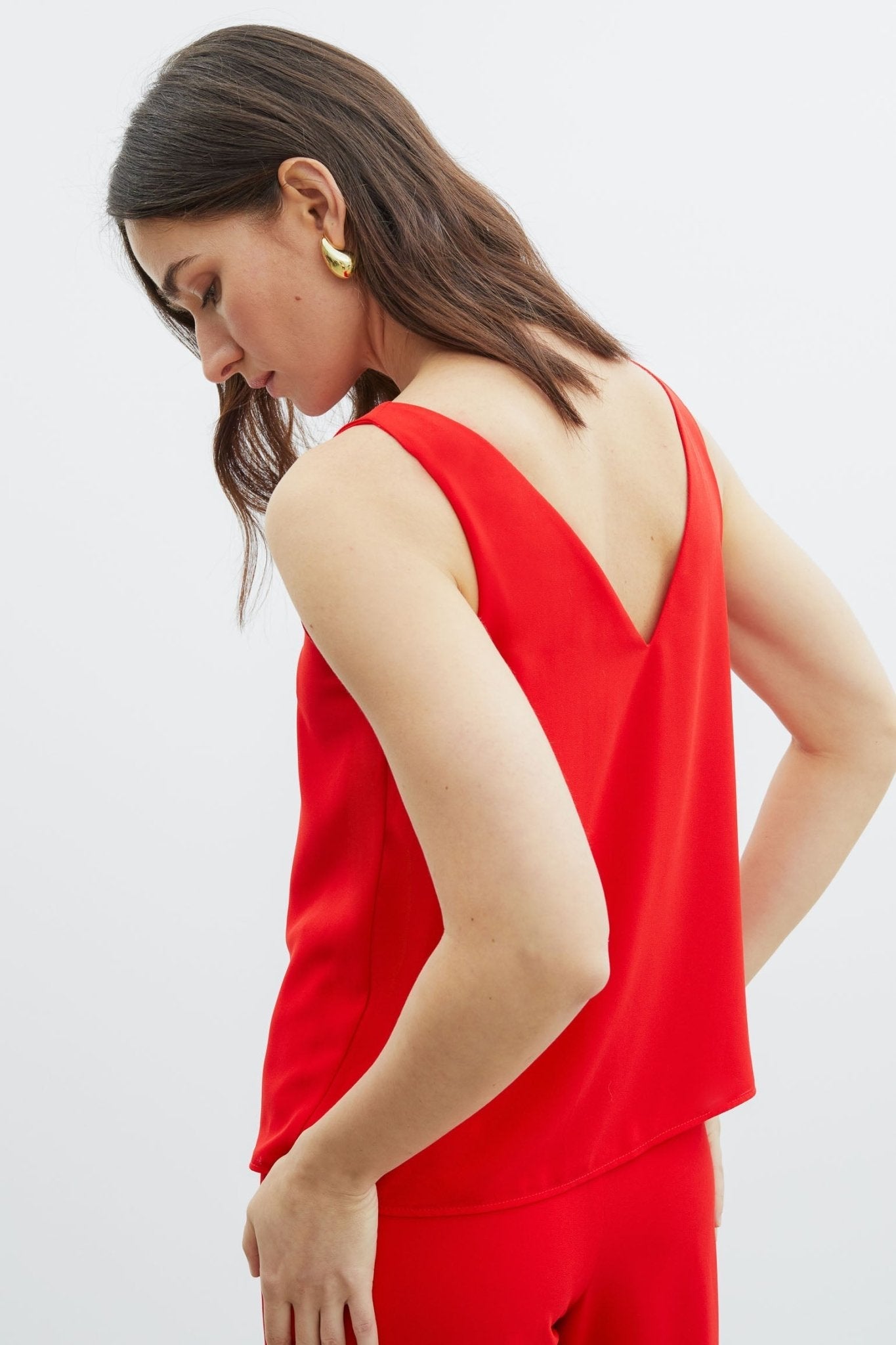 Top en tejido crepe georgette. Tirante ancho. Escote de pico por un lado y cerrado por otro. Diseño Twist que permite llevar el escote en pico en el delantero o en la espalda.