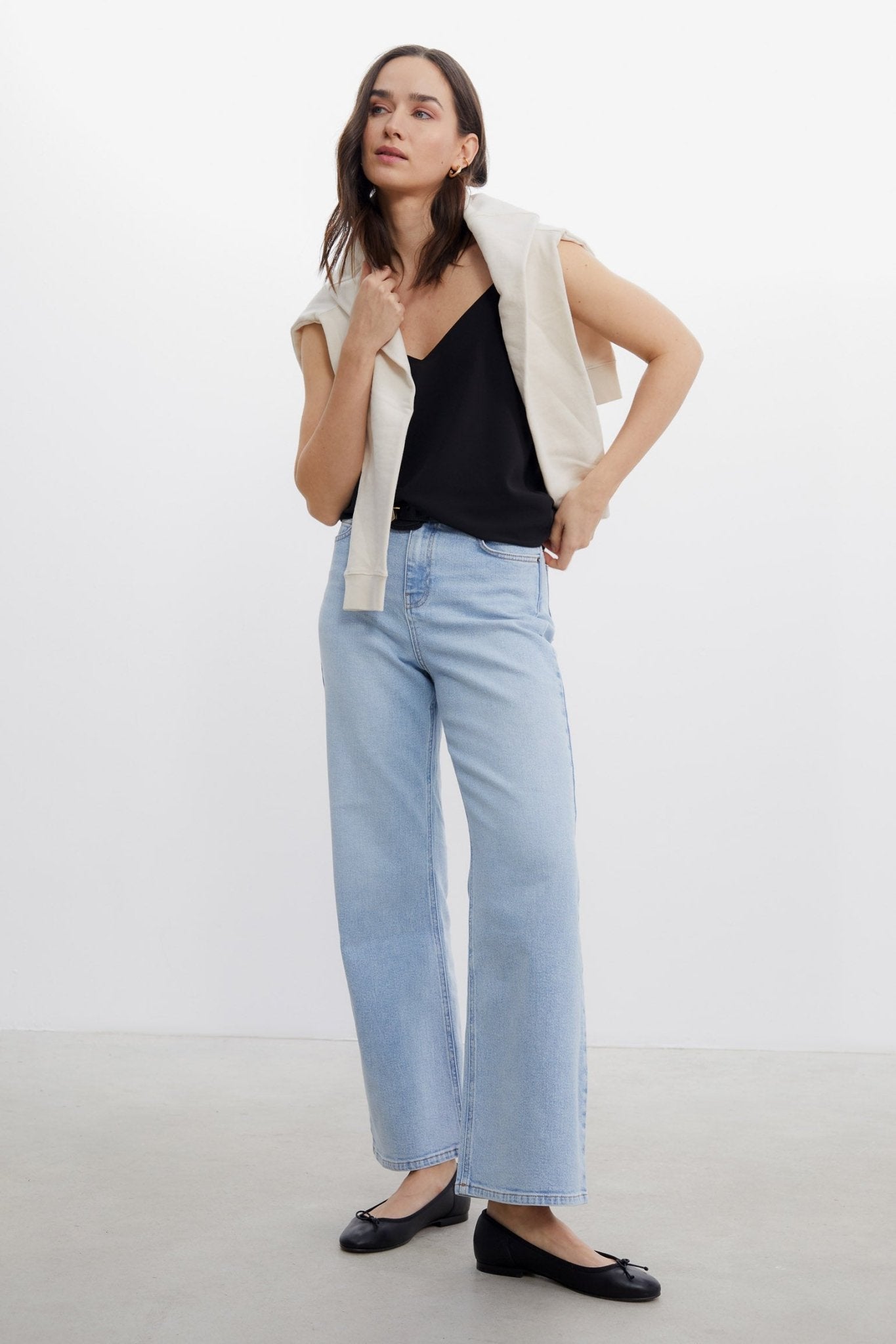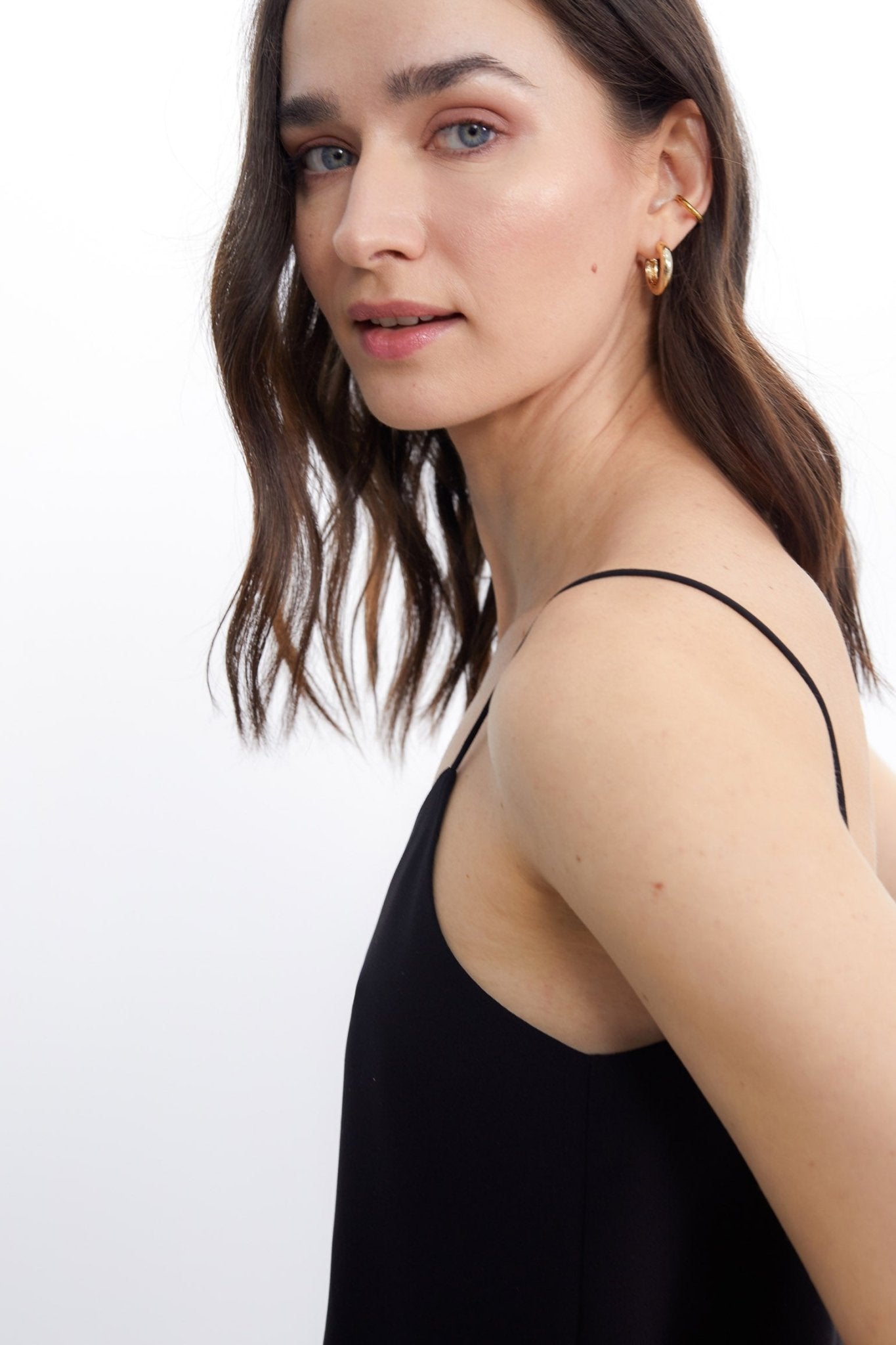 Top en tejido crepe georgette. Tirantes finos. Corte evasé. Escote de pico, más pronunciado en la espalda.