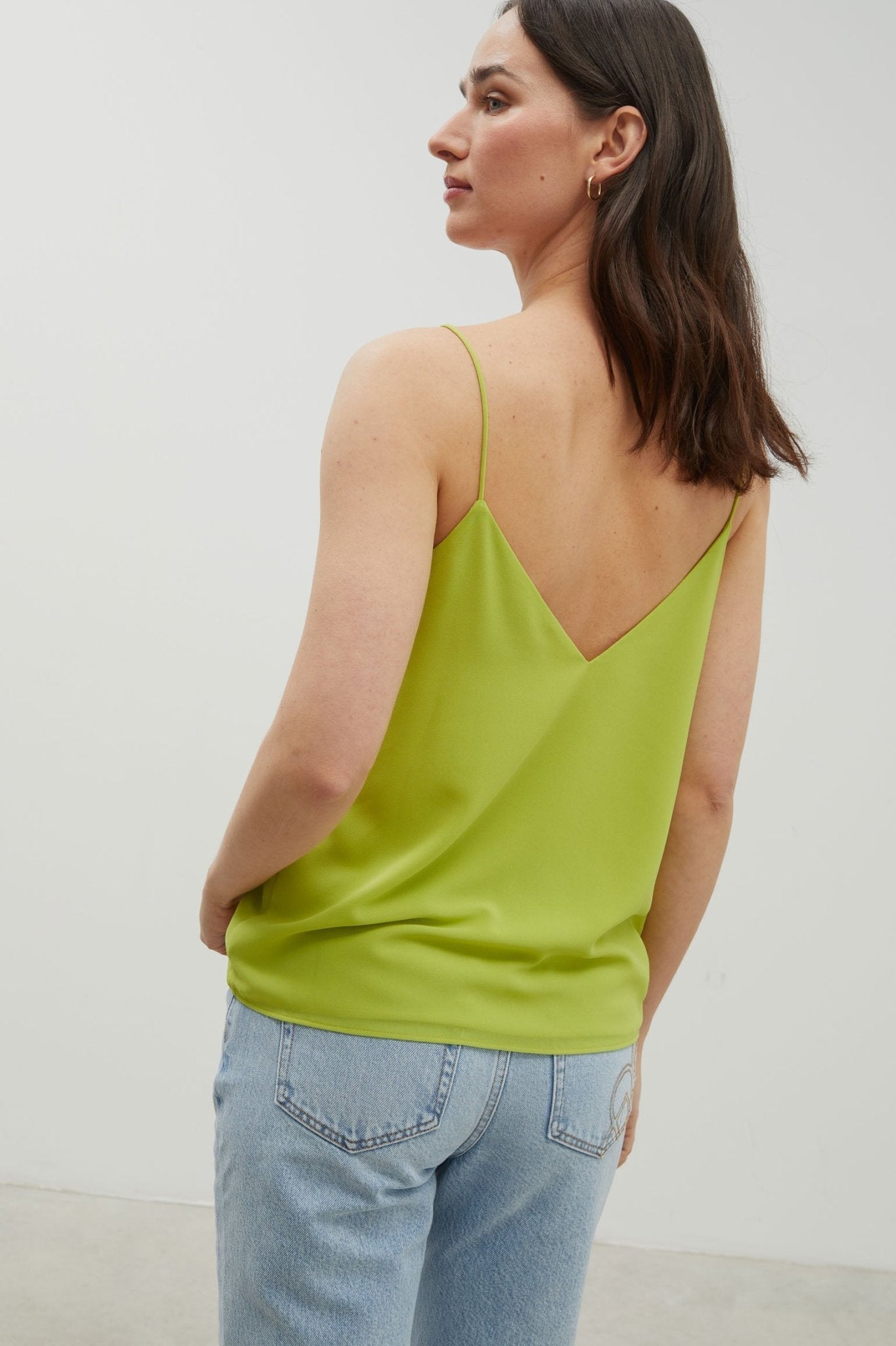 Top en tejido crepe georgette. Tirantes finos. Corte evasé. Escote de pico, más pronunciado en la espalda.
