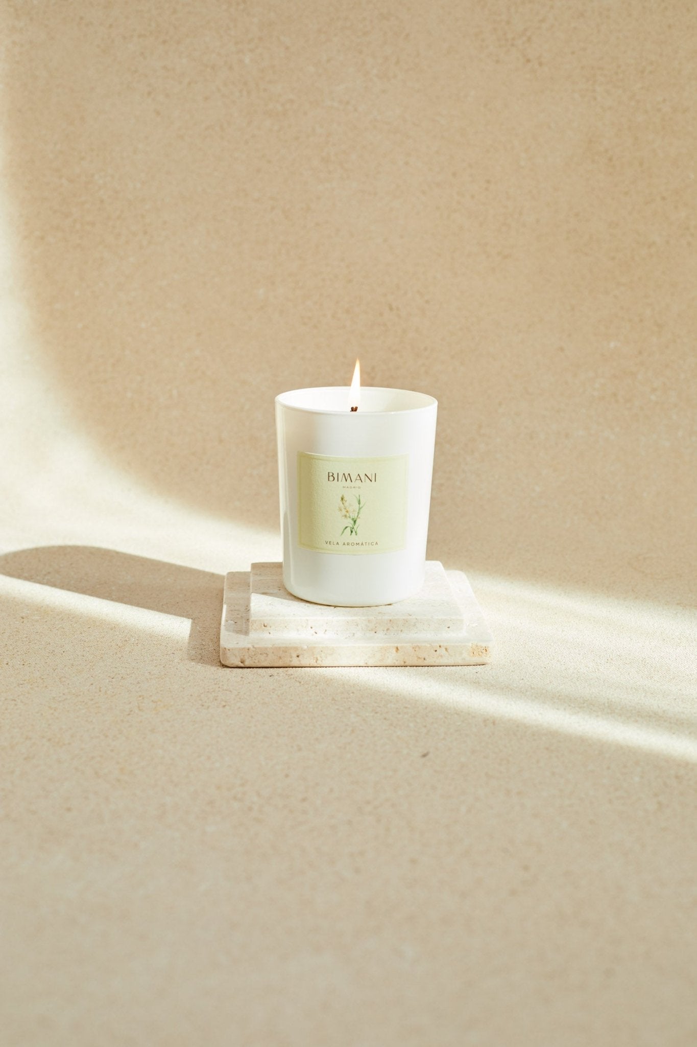 Vela aromática con aroma de flores blancas, jazmín blanco, flores de Tiare y mimosa.