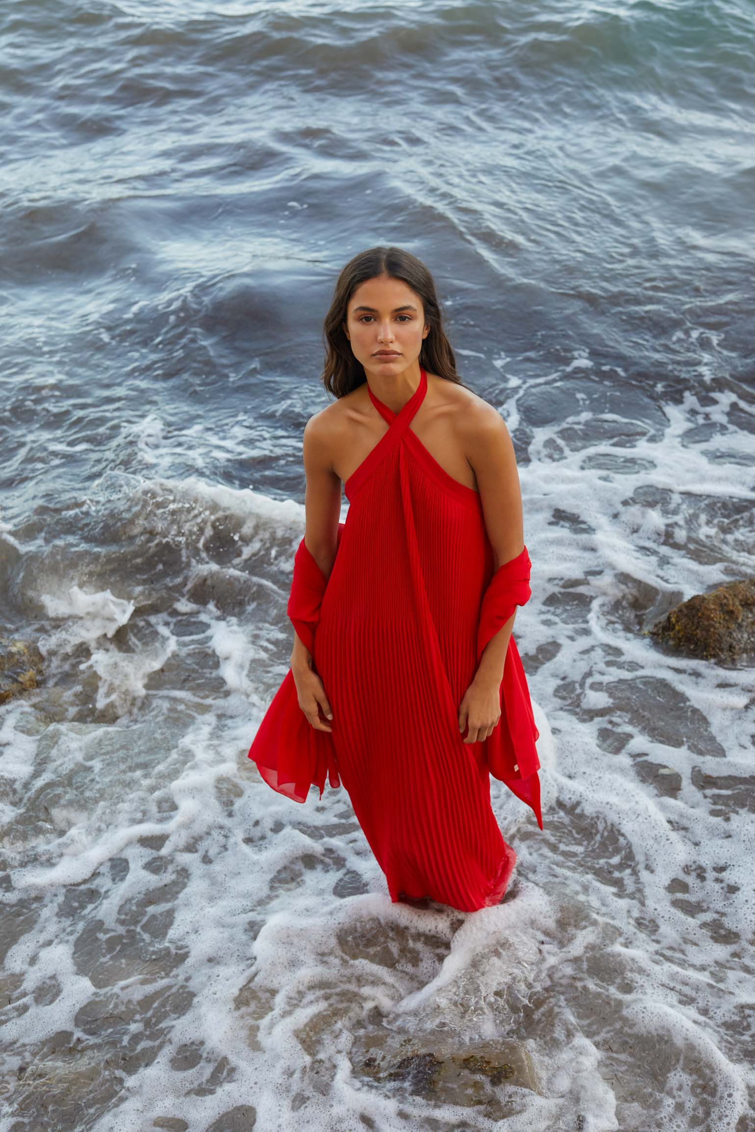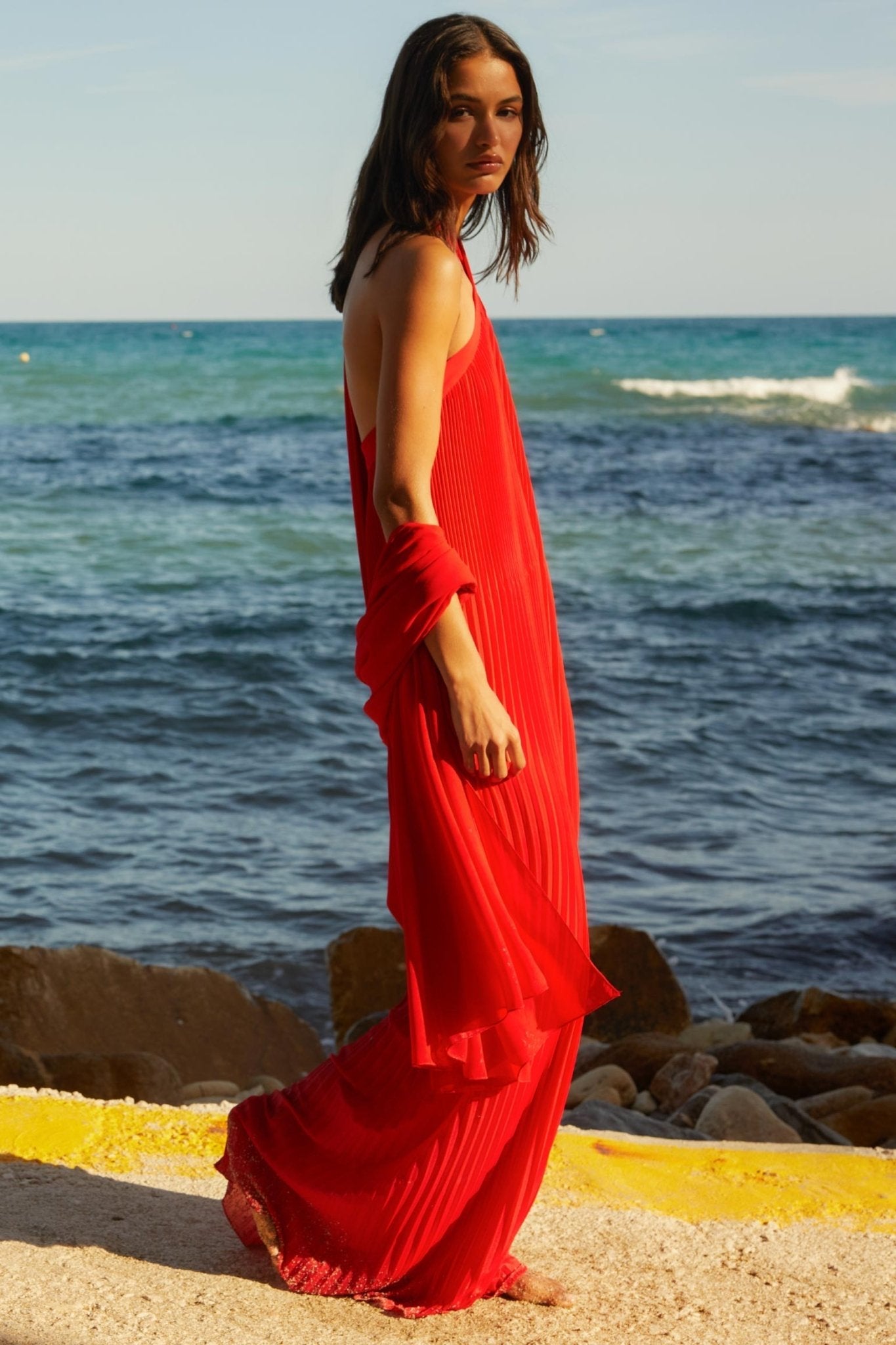 Vestido plisado en tejido crepe georgette. Largo maxi. Escote halter. Cierre mediante lazada anudada al cuello en espalda.