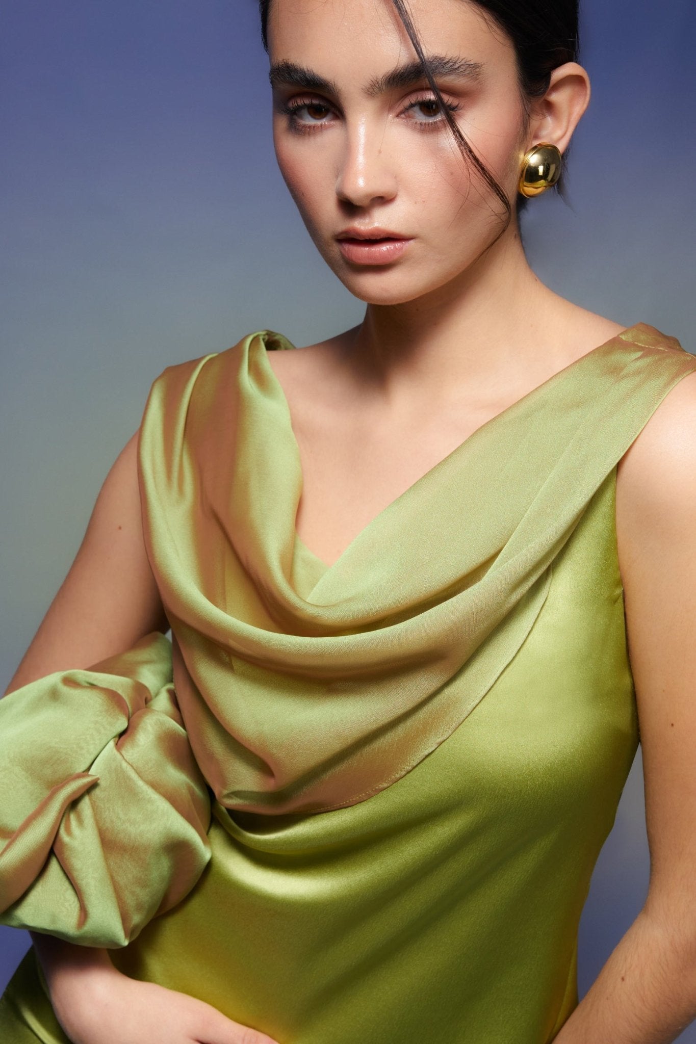 Top en tejido satinado. Sin mangas. Escote abierto con detalle de drapeado en tejido de gasa en el delantero y la espalda. Pliegues sutiles en hombros.