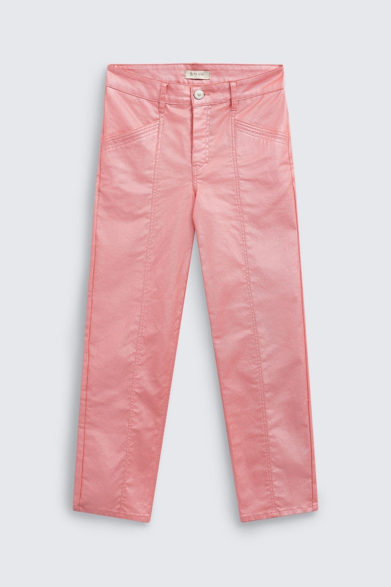 Pantalón de sarga con acabado metalizado. Corte recto. Tiro alto. Cinco bolsillos. Detalle de costuras marcadas en bolsillos.