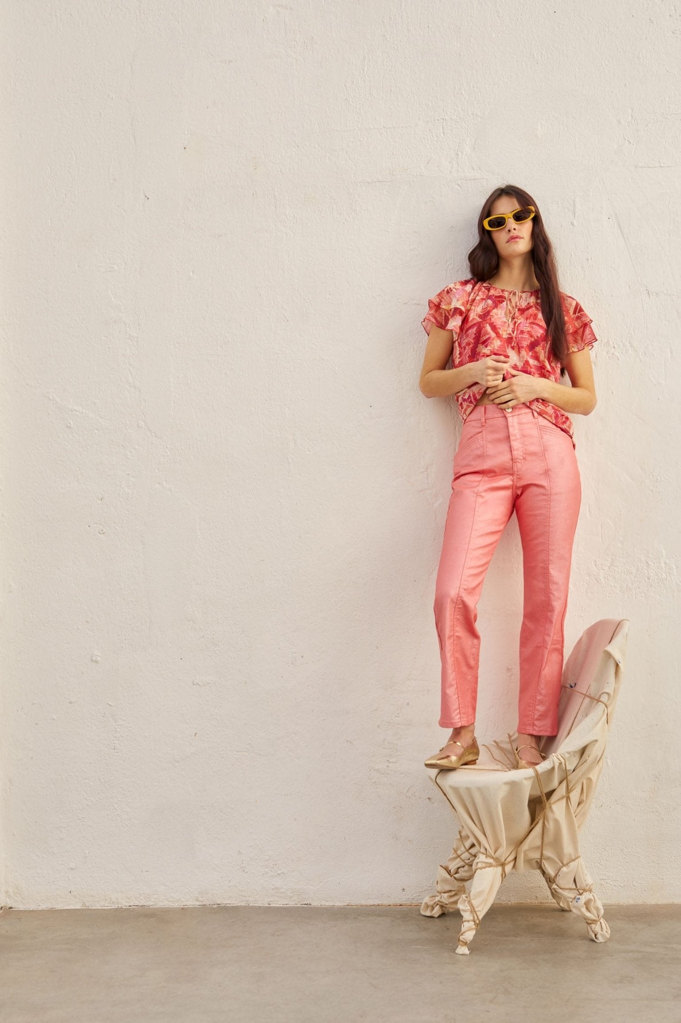 Blusa de gasa estampada. Manga corta con doble volante. Corte recto. Escote cerrado con detalle de lazada.