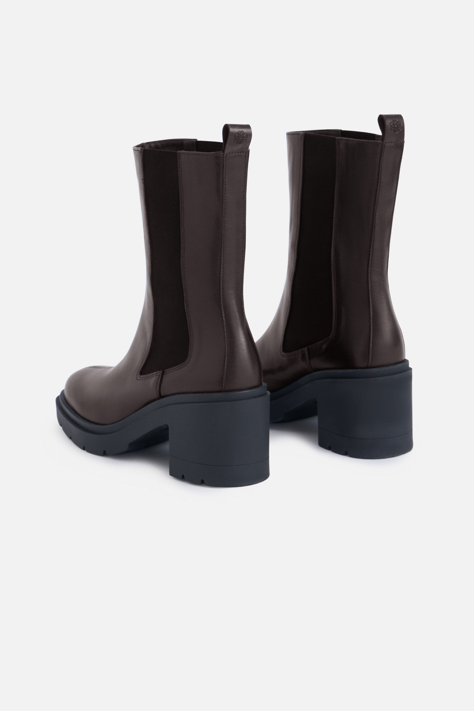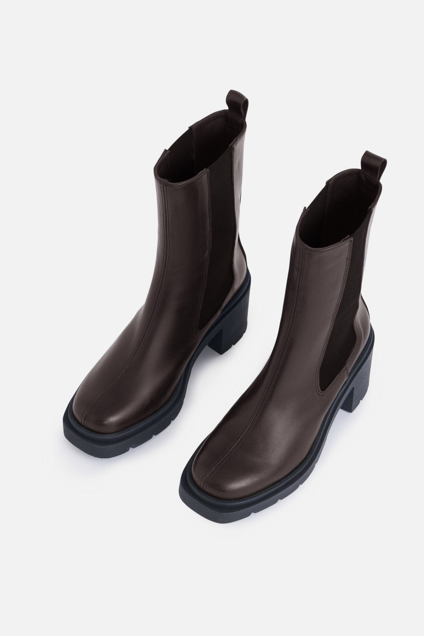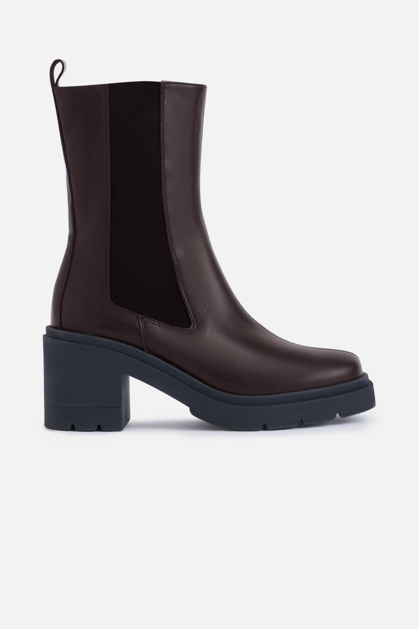 Botín de piel. Suela track. Caña media. Elásticos en laterales. Tirador en la parte trasera. Tacón de 7,6cm.