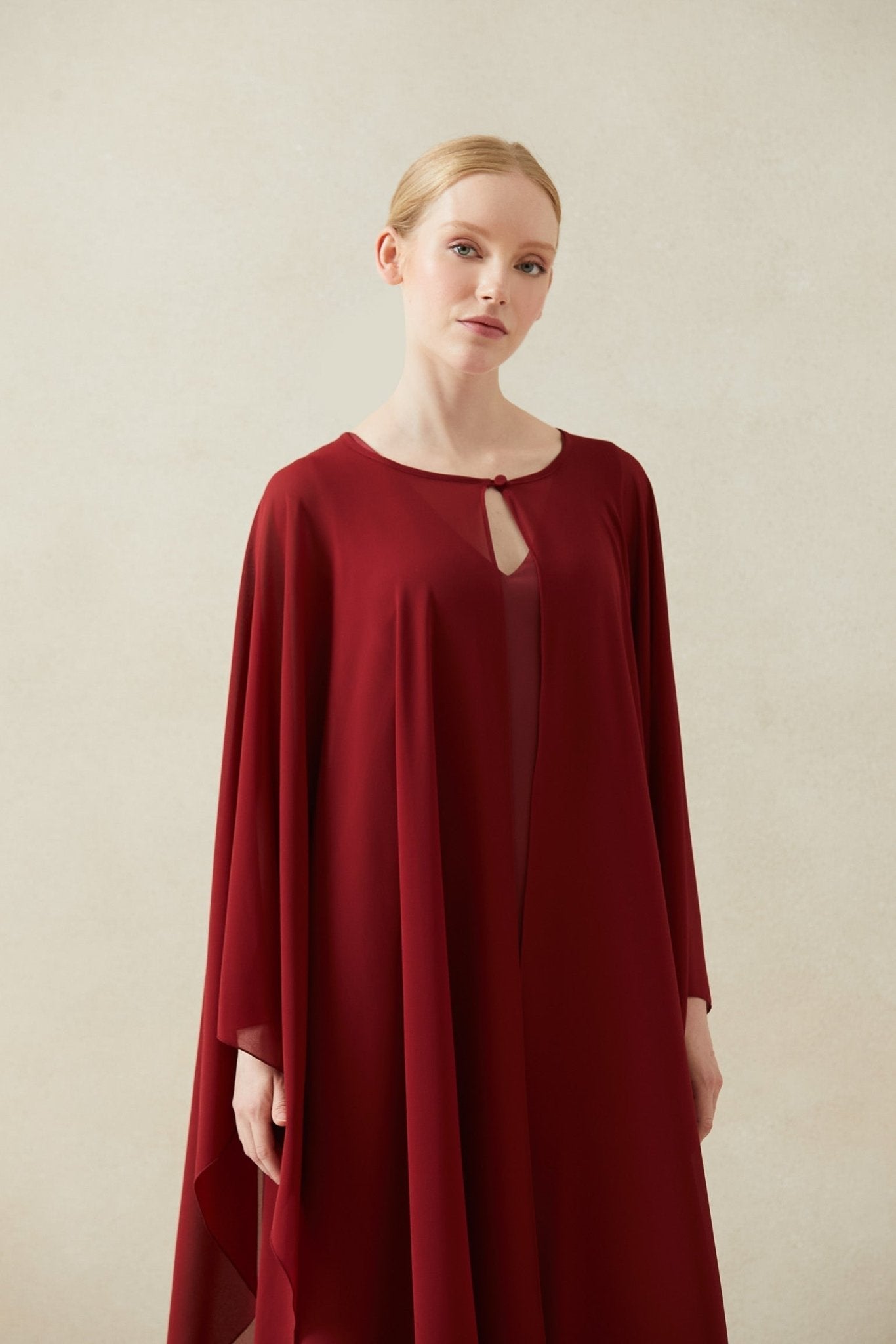 Capa multiposición con botón forrado y presilla.