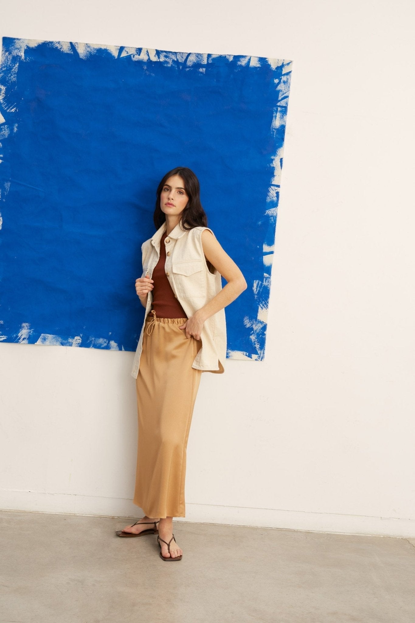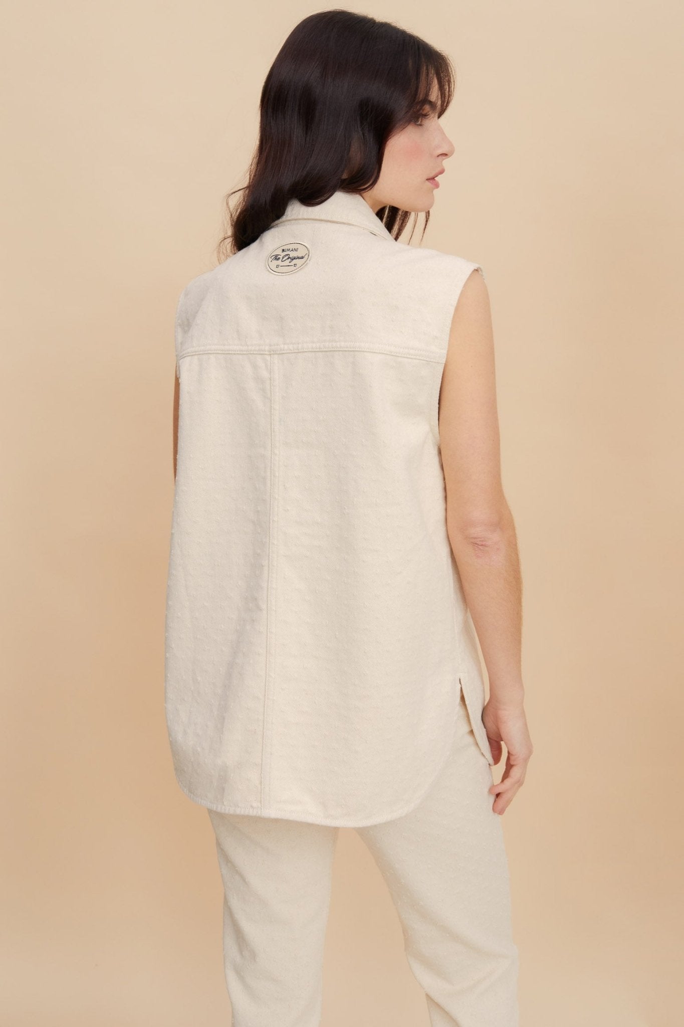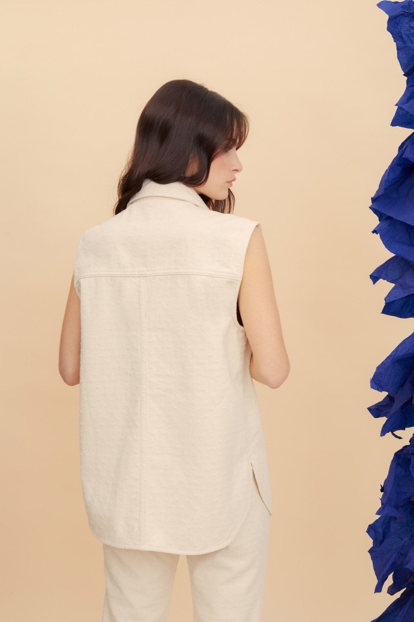 Chaleco en tejido denim. Corte oversize. Cuello camisero. Sin mangas. Detalle de dos bolsillos de solapa con botón de snap invisible en el pecho. Cierre delantero mediante botones de corozo.