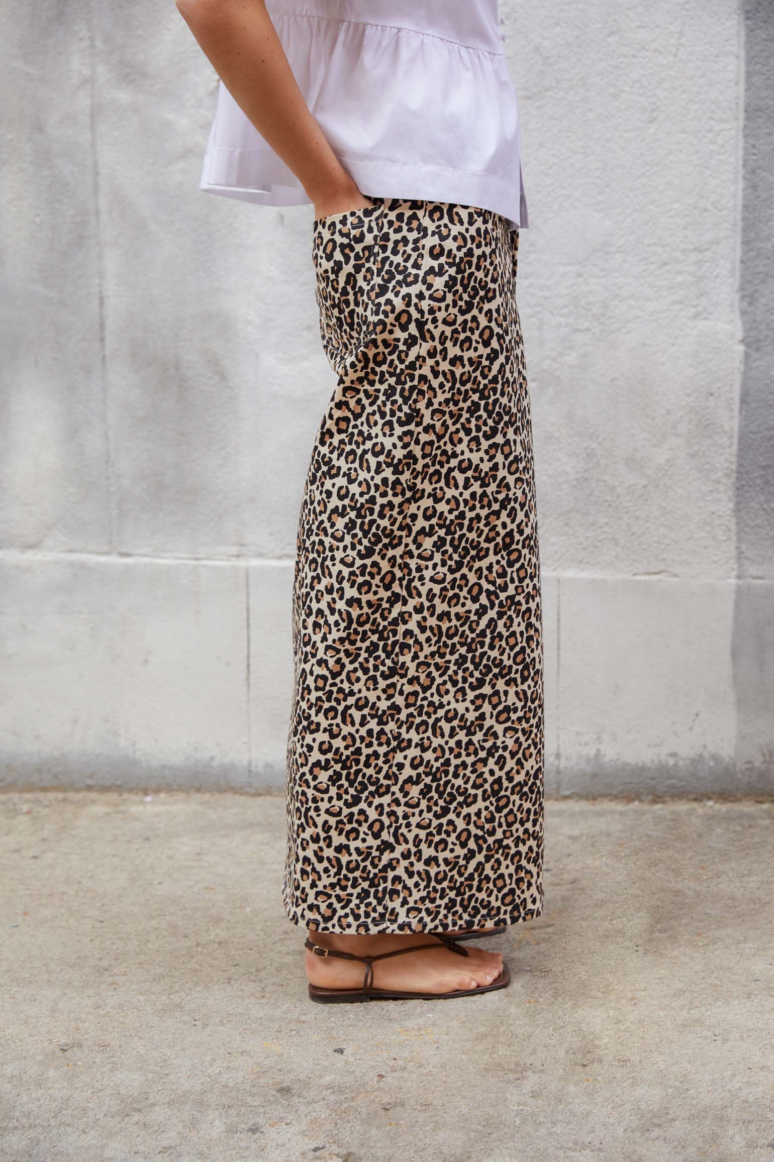 Falda en tejido de sarga de verano con estampado de animal print. Corte recto. Tiro alto. Largo tobillero. Detalle de abertura en centro delantero. Cierre mediante cremallera oculta y botón en delantero.