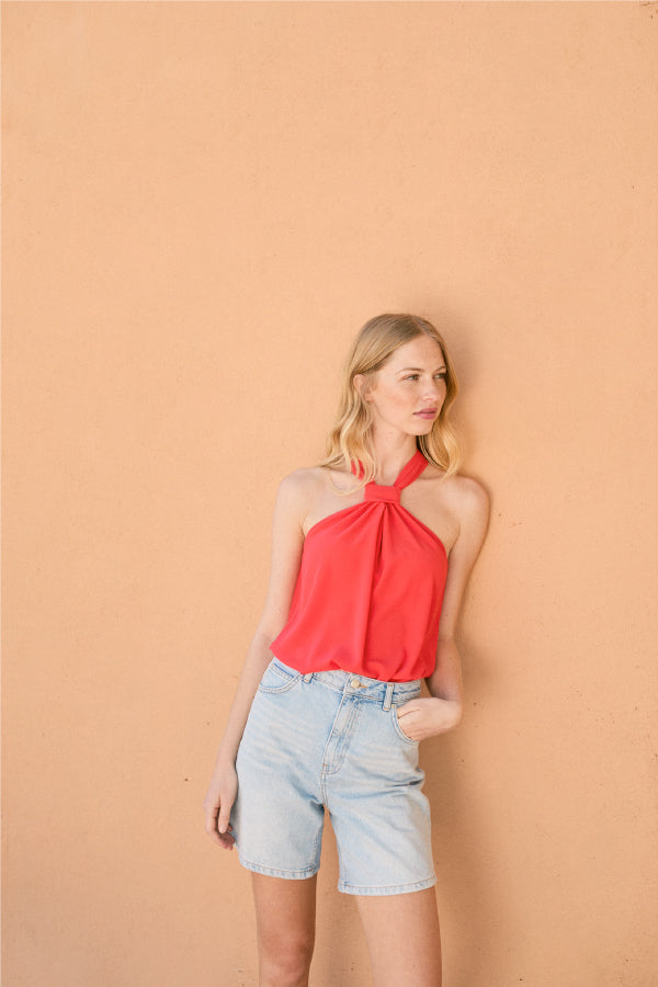 Top en tejido BIMANI. Sin mangas. Escote halter. Detalle de nudo en el escote. Cierre de botones forrados con lágrima en centro espalda.