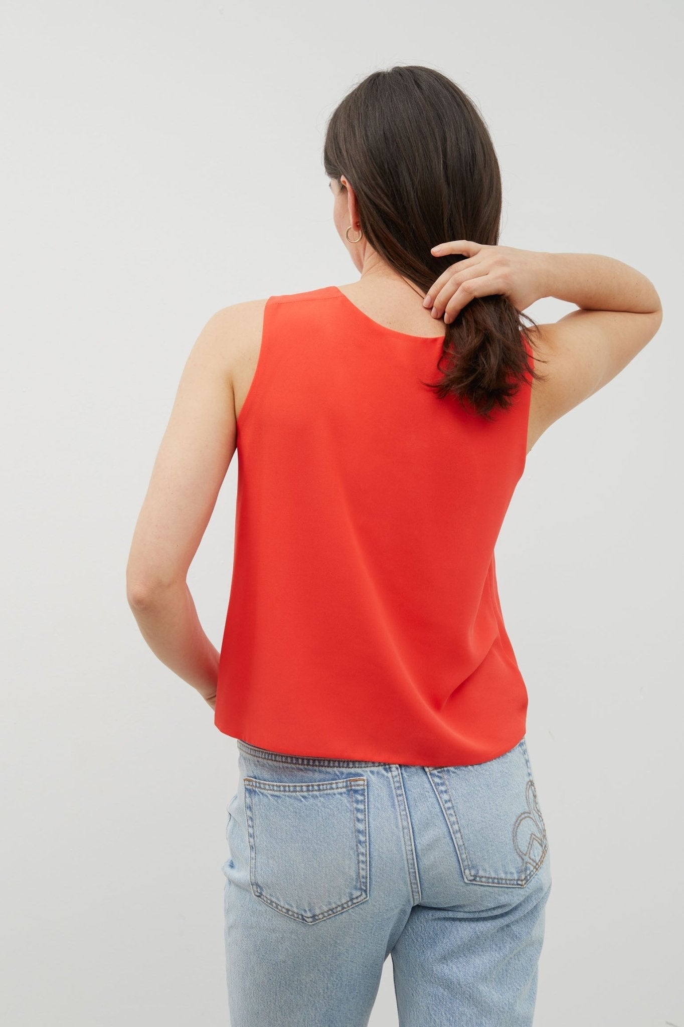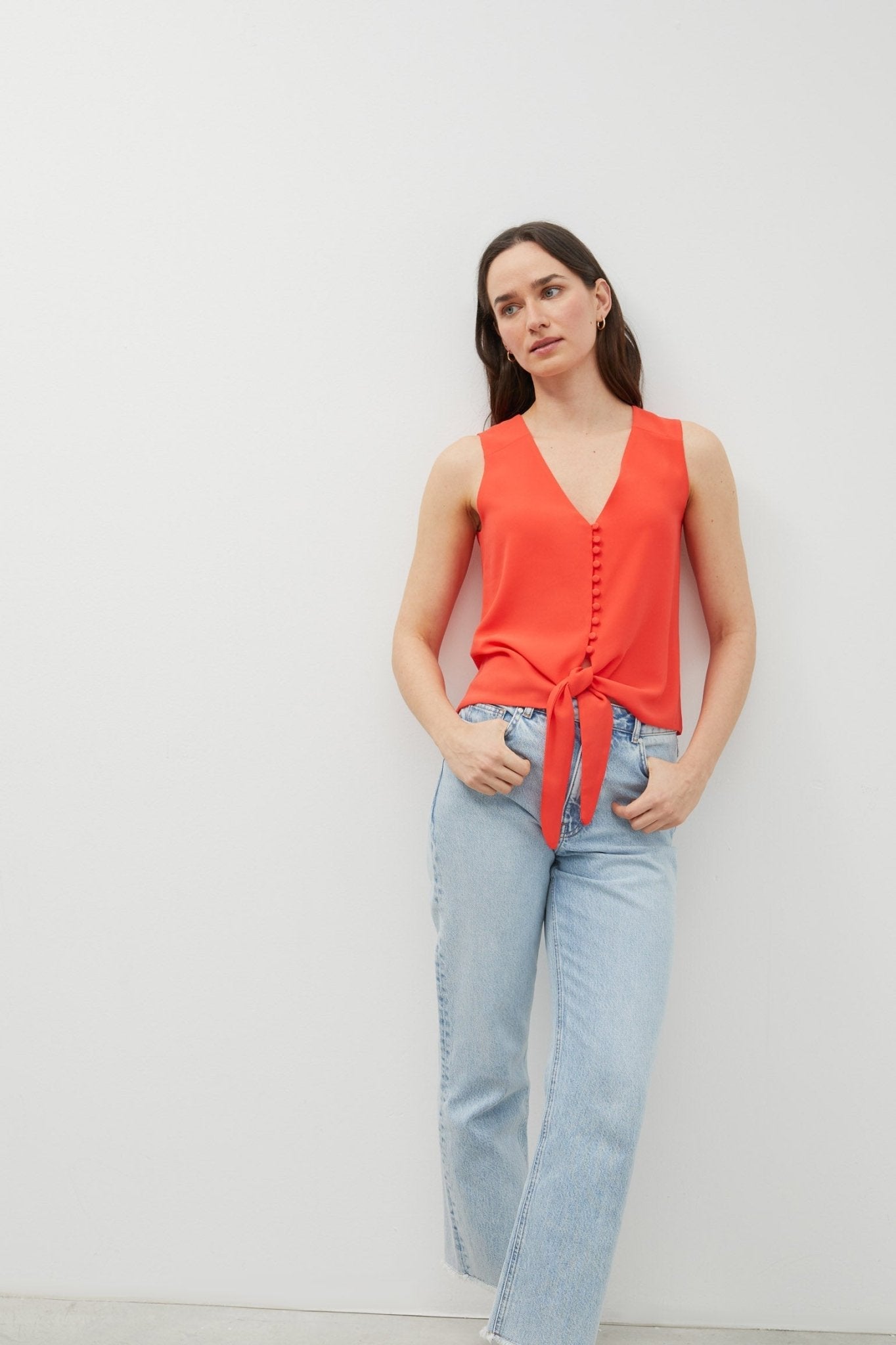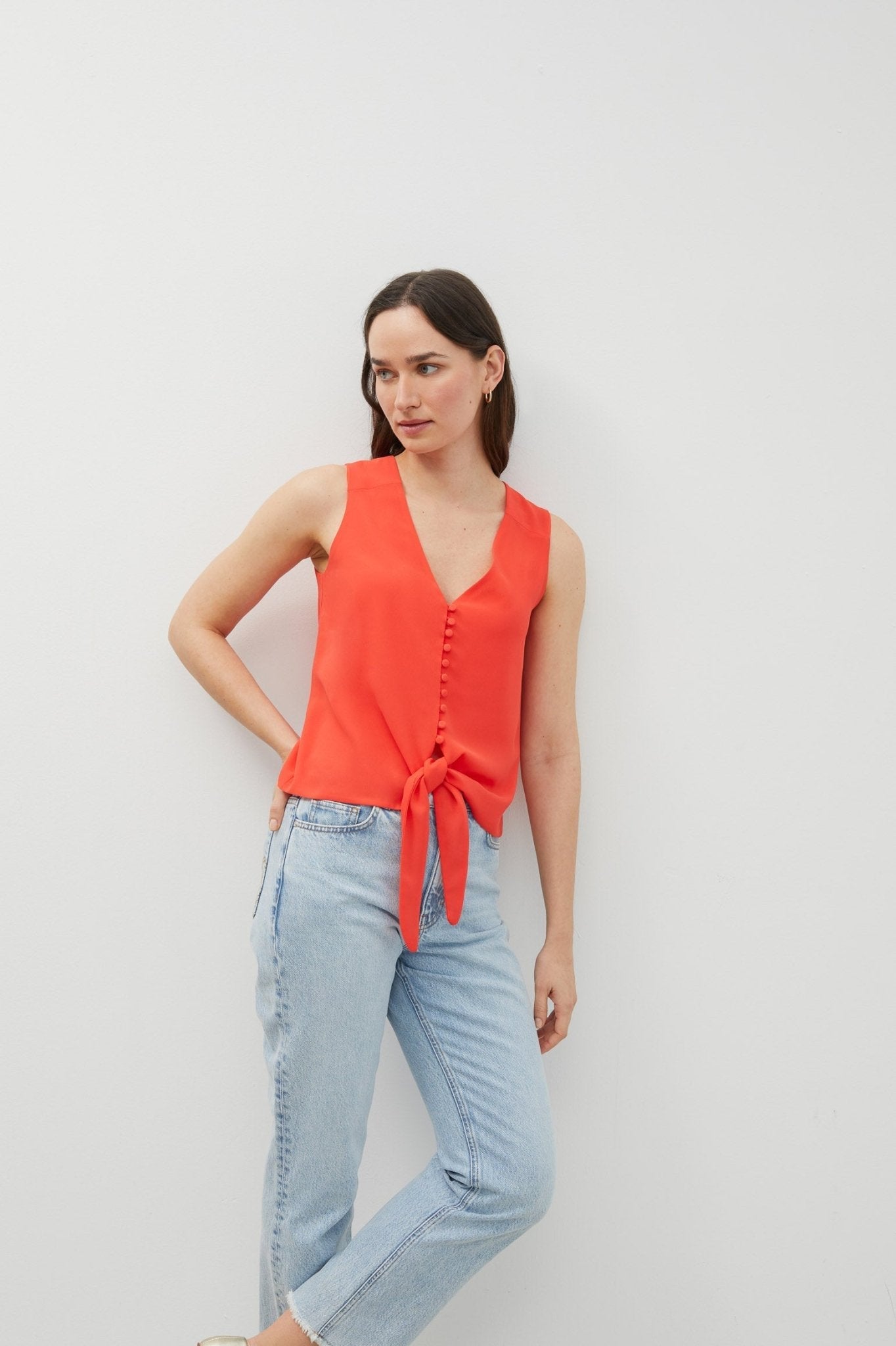 Blusa en tejido crepe georgette. Manga sisa. Escote de pico. Lazo para anudar en cintura. Cierre de botones forrados. Diseño Twist que permite llevar el escote de pico en el delantero o en la espalda.